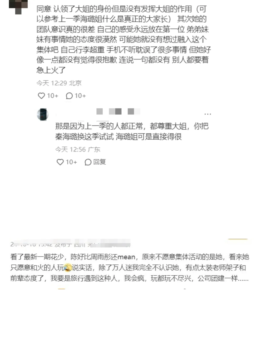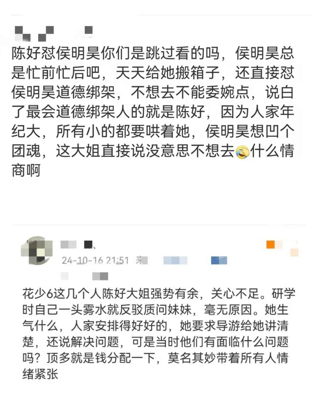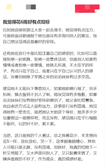 当侯明昊提出想让大家一起参加滑翔伞项目时,陈好表示:这样的团体活动并没有那么好的体验感。反驳了侯明昊以后又说他这样说就是在给自己压力,每句话都在表达自己的主观想法。不过这种只在乎自我的行为也不是第一次发生了。 快闪演出前一天,陈好周雨彤荣梓杉三人计划读诗,但是荣梓杉练习很久发现读诗不舒服,更想去唱歌,周雨彤本来想给他争取一下,但是陈好直接说“不是说好一起读诗吗”让周雨彤为难到不行, 一开始是自己提议读诗,改和弟弟唱歌觉得背叛了陈好,三人继续读诗弟弟又不舒服,最后只能周雨彤荣梓杉两人克服自己去配合陈好。 还有之前在荣梓杉邓恩熙当导游的时候,和两人说话基本都是反问语气,一连串质问明显给