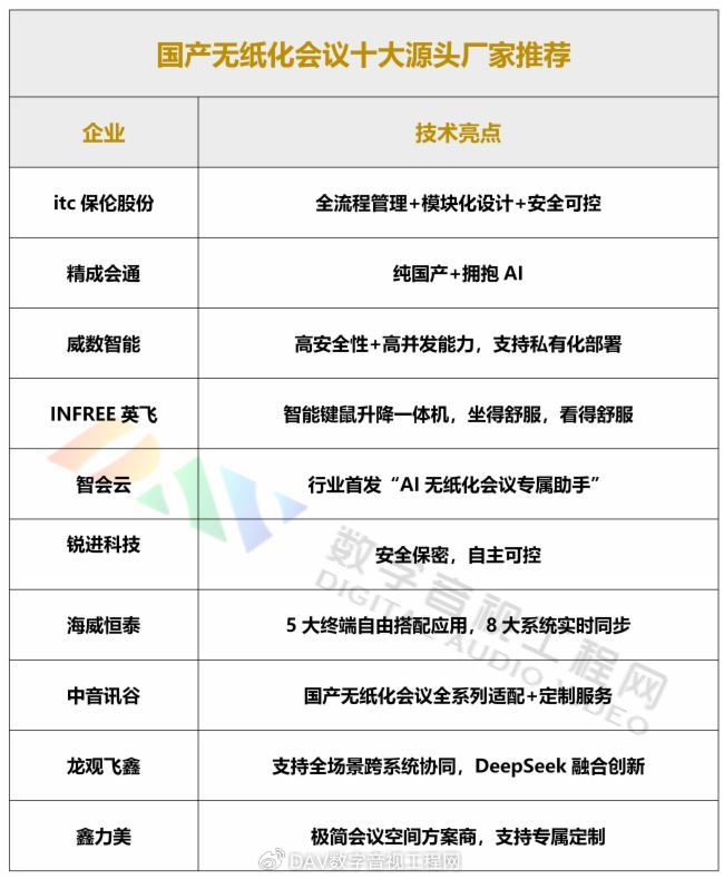 作为行业权威媒体,DAV数字音视工程网深入调研产业链,从生产制造、技术创新、市场应用等多个维度深入考察,成功精选出itc保伦股份、精成会通、威数智能、INFREE英飞、智会云、锐进科技、海威恒泰、中音讯谷、龙观飞鑫、鑫力美这十家具有源头研发制造能力的国产无纸化会议源头厂家。这些企业不仅是无纸化会议的"造风者",更是中国智造在办公数字化领域的缩影。