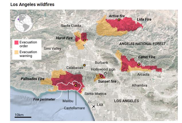 加利福尼亚消防队员正奋力扑救被圣塔安娜风和极度干燥气候加剧的多起野火。这些火灾不仅摧毁了数千座房屋,还导致道路拥堵,迫使数万居民紧急撤离。截至周三,至少有70,000名居民被下达疏散命令,近30,000座建筑面临威胁。