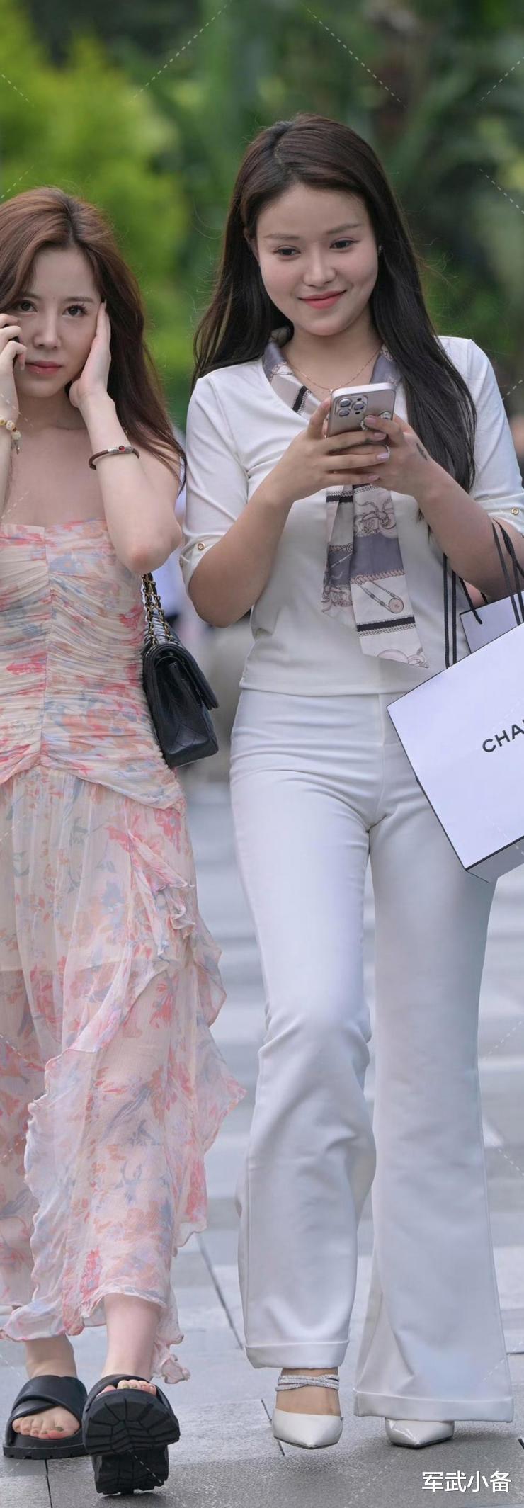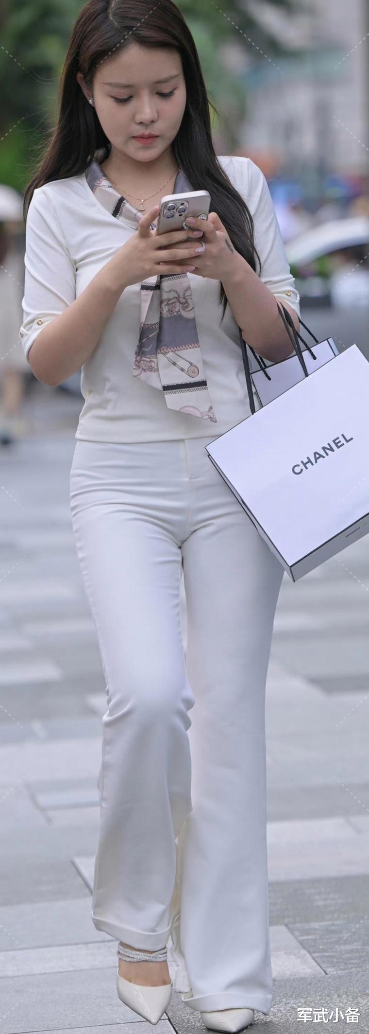 “白色上衣搭配白色西裤与白色尖头高跟鞋”的这一组合,很有魅力