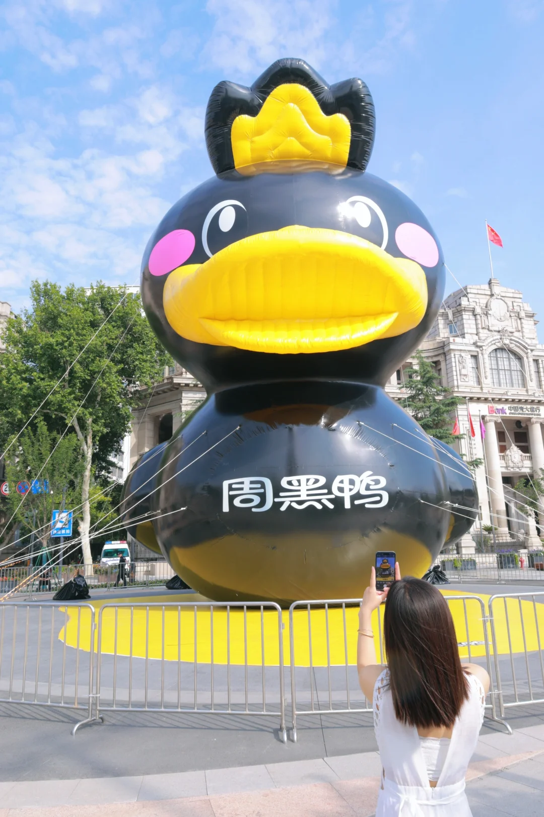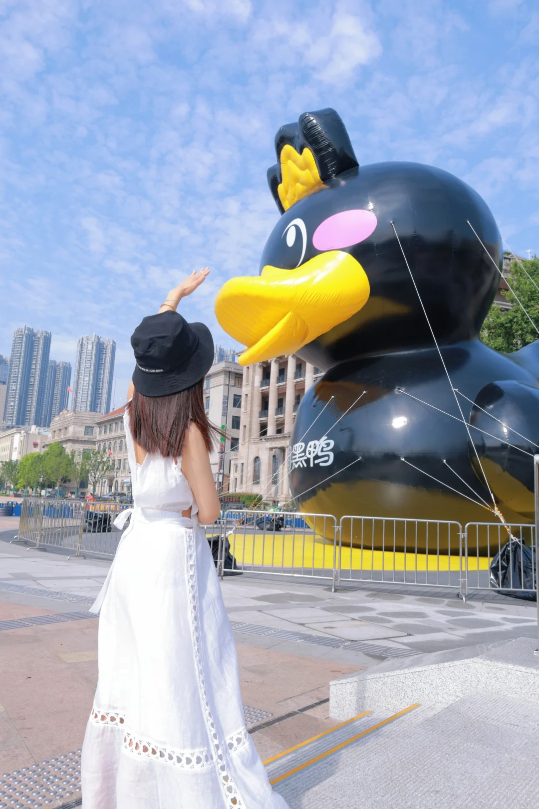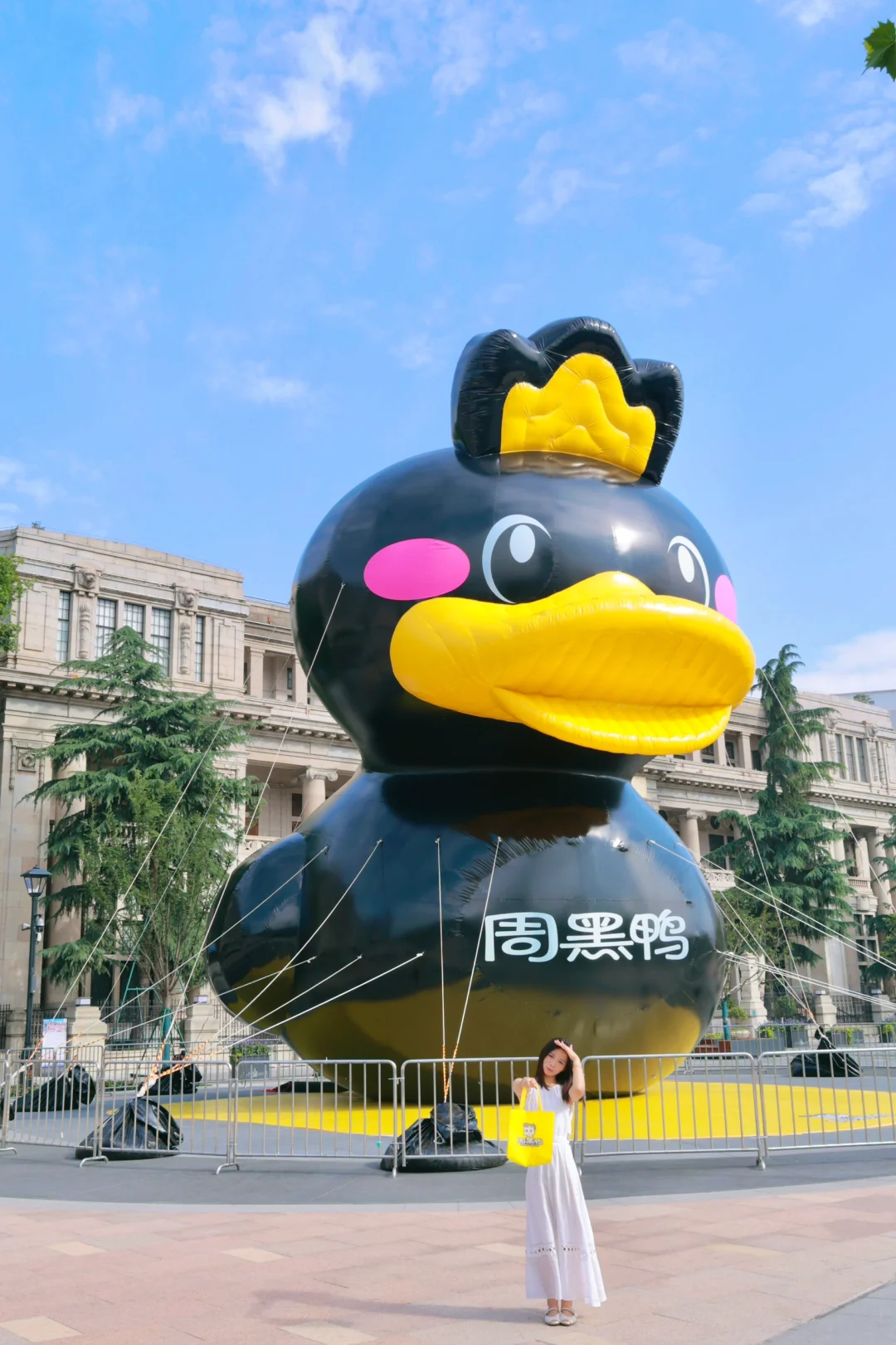 武汉科技馆对面偶遇十几米高的大黑鸭!大黑鸭巨巨巨可爱🥰!小姐姐们新机位赶紧拍起来!,听说是为了庆祝周黑鸭30周年庆,真的太用心了❤️!建议白色or黄色,浅色更出片哦!记得借角度拍摄如喂食、手指互动、无人机视角更绝!