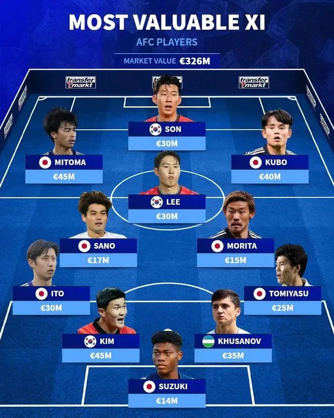 近日,德国转会市场网站公布的亚足联最贵11人阵容引发热议——日本7人、韩国3人、乌兹别克斯坦1人,总身价高达3.26亿欧元,而中国球员无一上榜。更令人唏嘘的是,当前亚洲身价前十的球员中,日韩包揽全部席位,中国球员武磊仅以120万欧元位列百名后,甚至不及巅峰时期的几分之一。这一现实不仅折射出中国足球与国际顶尖水平的差距,更让球迷追问:中国何时能再培养出一名跻身亚洲前十的球员?