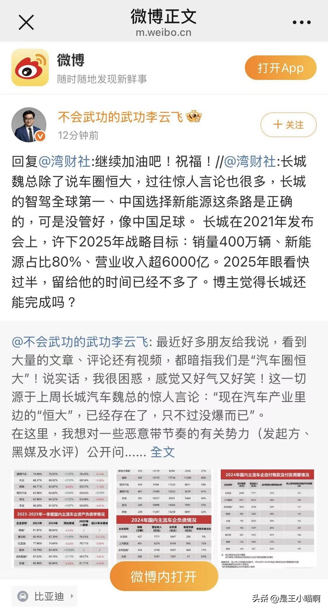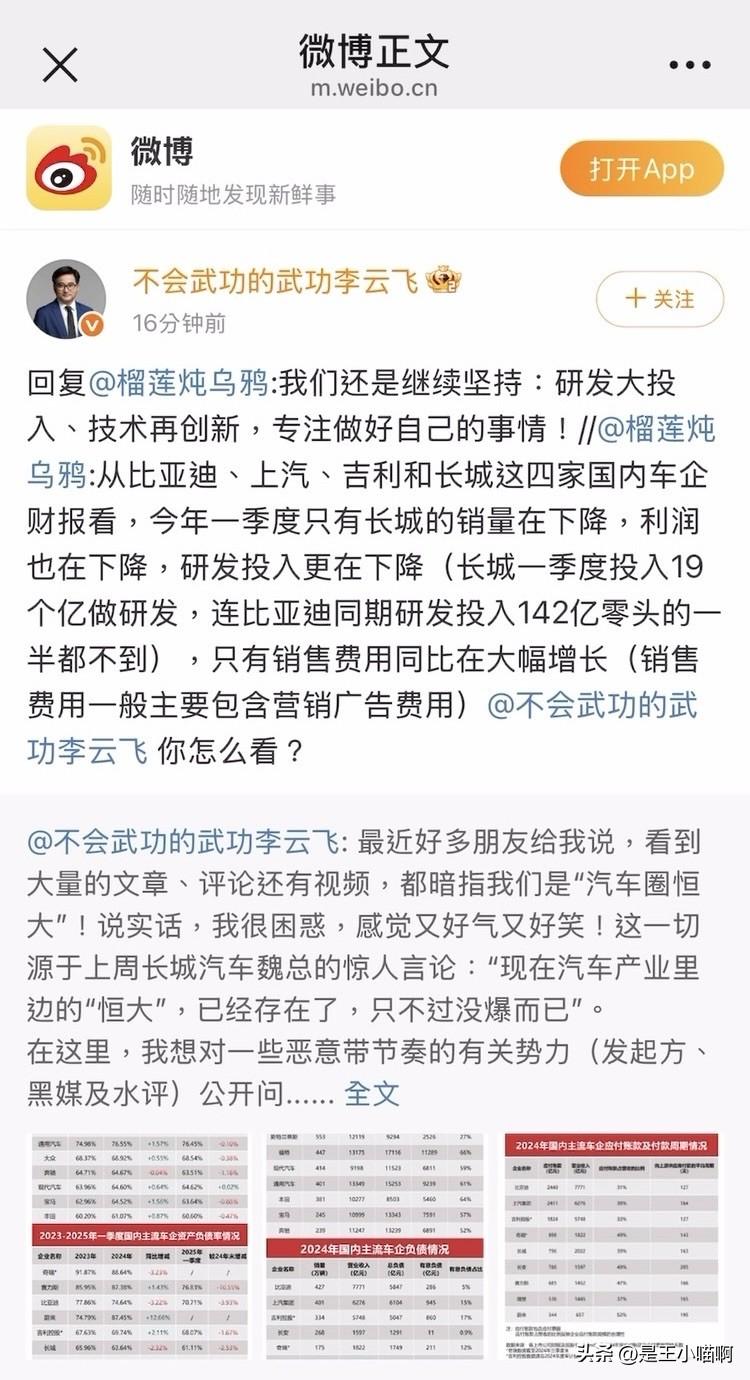 近日,长城汽车魏建军“汽车产业已存在恒大式企业”言论引发行业震动,部分舆论暗指比亚迪。比亚迪品牌总经理李云飞今日发长文强势回应:“感觉又好气又好笑!”并晒出五大核心数据打脸质疑: 1️⃣ **负债率对比**:比亚迪资产负债率70%,低于福特(84%)、通用(76%)、苹果(80%); 2️⃣ **总负债规模**:5800亿远低于丰田(2.7万亿)、大众(3.4万亿),有息负债仅286亿,不足吉利(860亿)三分之一; 3️⃣ **供应商账期**:应付账款占营收比31%低于长城(39%),付款周期127天短于长城(163天); 4️⃣ **业绩硬实力**:2024年营收7771亿、净利润403亿、研发投入542亿、现金储备1549亿,创30年最佳。 李云飞强调,中国车企负债结构优于国际同行,“唱衰中国新能源不可取!”中国品牌国内市占率超60%,新能源渗透率破52%,出口全球第一。