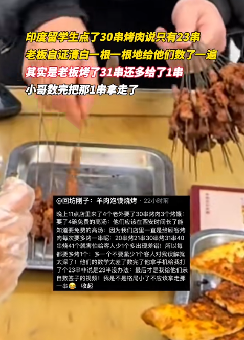 极目新闻的报道,西安一家泡馍店发生了一起纠纷。原来是四名印度留学生点单30串烤肉后,自己数完之后,当场质疑老板只烤了23串,要求退款。而店里的服务生,让他们重数一下,结果这四位连30个阿拉伯数字都搞不清楚,数了几串就跳数,数到11、12然后直接18、19了,少了7串,对上了。