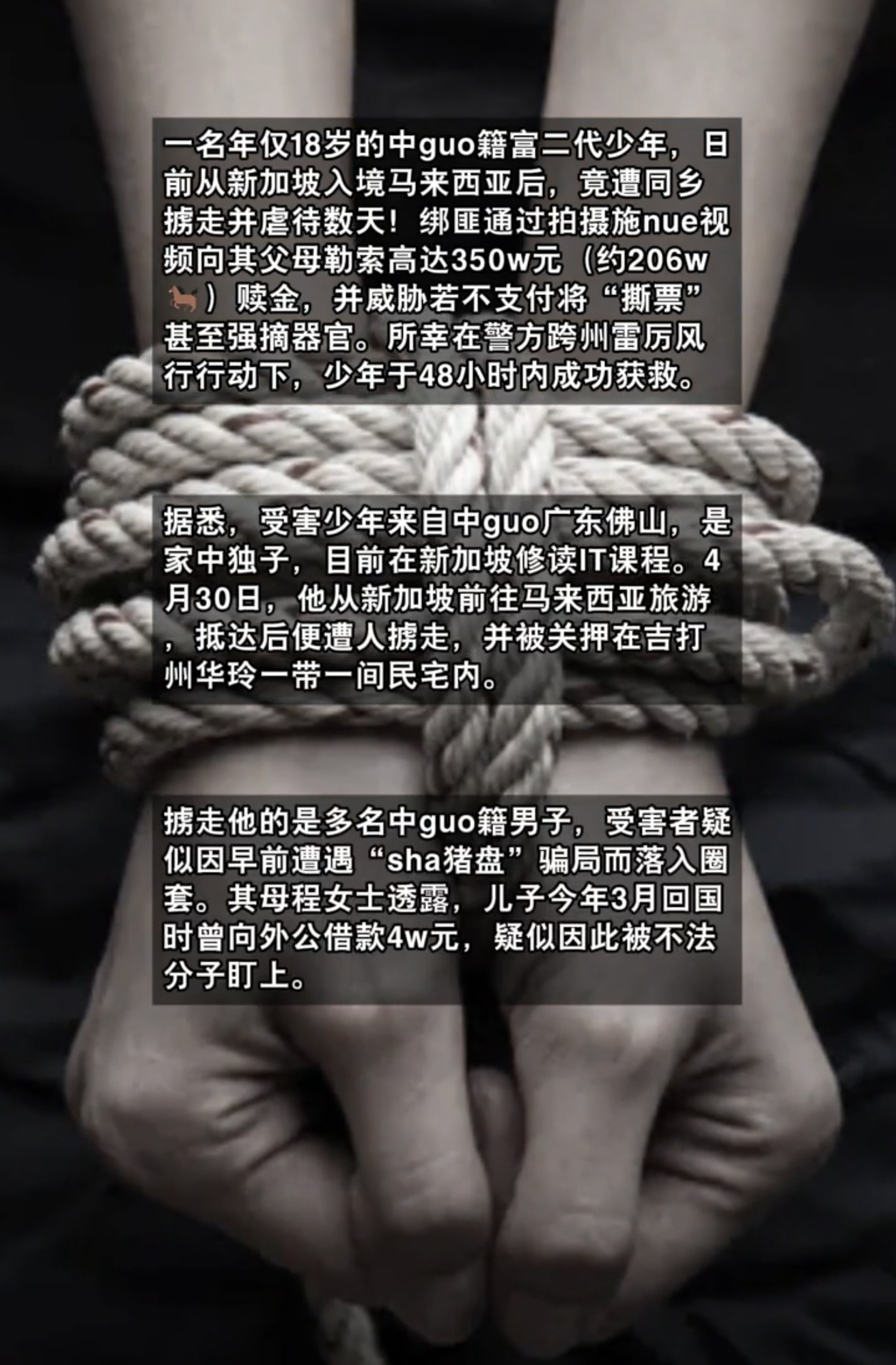 现在网上吵得凶的是,这绑匪咋就盯上中国留学生了?前两年老听说什么虚拟绑架诈骗,现在直接升级成真人摘器官威胁了。再说这赎金要的数目也邪乎,350万现金说拿就拿?怕不是早摸清了人家底细。还有人说这伙人专业得很,从新加坡盯梢到马来西亚下手,赎金要打到第三国,整个犯罪链横跨三个国家,真·跨国狼人杀剧本。