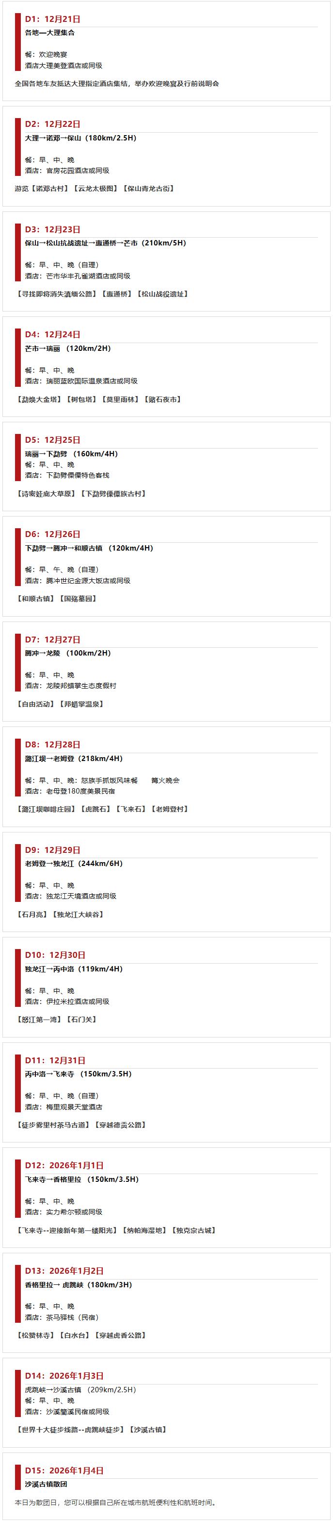 行程信息:大理→诺邓→保山→松山抗战遗址→惠通桥→芒市→瑞丽→下勐劈→腾冲→和顺古镇→龙陵→老姆登→独龙江→丙中洛→飞来寺→香格里拉→虎跳峡→沙溪古镇