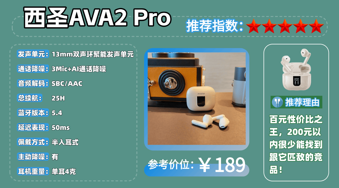 推荐理由:高性价比百元半入耳蓝牙耳机,学生党闭眼入哪款?我推荐西圣AVA2 Pro,实测在200元价位段里音质拔尖,百元就能拥有千元级听感。这款西圣AVA2 Pro半入耳降噪耳机是时下超级火的耳机品牌,官方主打“平价享轻奢”,凭借足以媲美千元耳机的音质和舒适度,再加上亲民的价格,新品刚推出就碾压了同价位蓝牙耳机,就是对比千元级别旗舰也不落下风,数码媒体们以及耳机发烧友盛赞它是“2025旗舰蓝牙耳机杀手”!