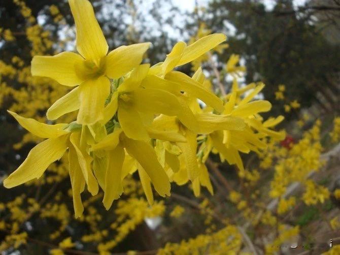|中药小识:春日一抹黄—姐妹花 连翘花和迎春花,花容相似。区别有很多,最直观的、一眼就能辨别的是——连翘花4瓣,迎春花6瓣。这二位长的像,是因为近亲的缘故,都是木犀科植物,连翘为连翘属,迎春花为素馨属。另外一个较大的区别是,连翘长果实,迎春花不结实。 【药用价值】 (1)连翘 连翘花不入药,所结果实药名“连翘”,是一味常用的中药。是泻心经客热、去上焦诸热、治疮疡瘤瘿结核的要药。 (2)迎春花 迎春花,虽然在《本草纲目》有载,但入药部位是“叶”。 【气味】苦、涩,平,无毒。 【主治】肿毒恶疮,阴干研末,酒服二三钱,出汗便瘥(《卫生易简方》)。 《贵州民间药物》载有迎春花入药:“性平,味苦。”“解热利尿,治发热头痛,小便热痛。”内服: 煎汤,6~9克; 或研末。①治发热头痛: 金腰带花15克,煎水服。②治小便热痛:金腰带花15克,车前草15克,煎水服。 连翘是一味常用中药,敬请关注长文分解。 今年还没时间和机会出去看春色,迎春花和连翘的照片是从QQ空间里找来的2010年的照片。春色绚烂,转眼10年,那会儿我们还在用Q分享时光,只是时光太匆匆…… 都不记得是在哪个公园拍的了,谁能告诉我? 后两张图片来自网络。
