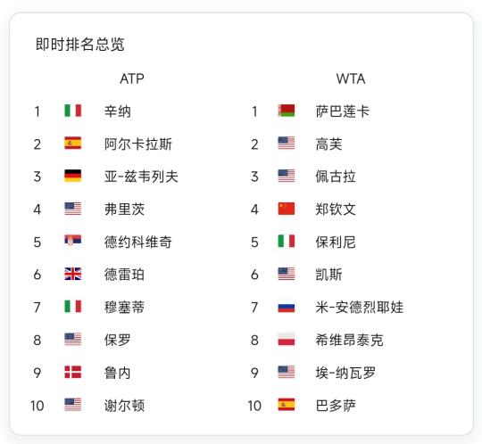 顶级球员用什么品牌网球拍呢? HEAD 男子5人 女子1人 总计6人 YONEX 男子2人 女子4人 总计6人 WILSON 男子0人 女子4人 总计4人 BABOLAT 男子2人 女子0人 总计2人 DUNLOP 男子1人 女子0人 总计1人 泰尼飞 男子0人 女子1人 总计1人 HEAD:德约,辛纳,紫薇,负离子,穆塞蒂,高芙 YONEX:保罗,谢尔顿,莱巴,凯斯,大富,二富 Wilson:郑钦文,萨巴伦卡,小米辣,巴多萨 BABOLAT:阿卡,鲁内 dunlop:德雷珀 泰尼飞:丝袜