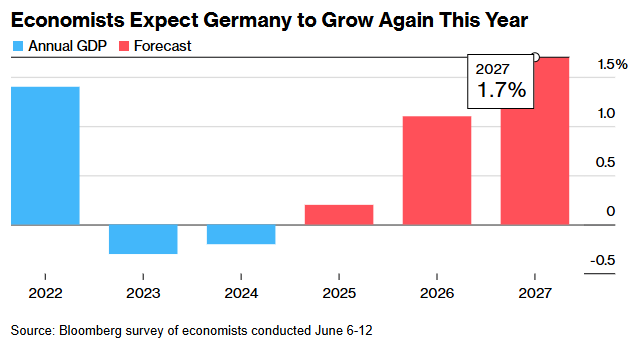调查显示,分析师预计德国将在连续两年萎缩后于2025年恢复增长,GDP增幅0.2%。这一展望较多数机构近期预测的零增长更为乐观。