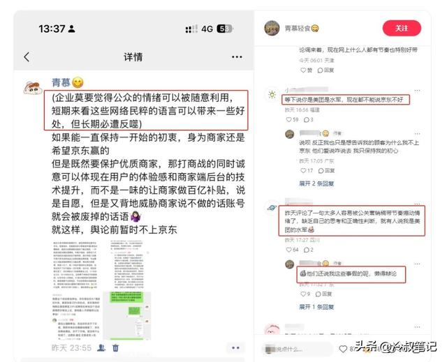 有商家提问,为什么京东外卖0抽佣,到手却只有消费者实付的一半。热心同行解答疑问,列出所有可能性:因为你的活动开得太大,百亿补贴需商家承担一半成本;因为配送距离太远,平台扣除了远距离配送费。原本是餐饮商家之间的正常的业务交流,还是给京东外卖贡献的流水的,也被东粉打成黑子。究竟是晒后台订单截图、条分缕析的商家像水军,还是在帖子下刷屏“多少钱一条”的乱码ID,更像水军?