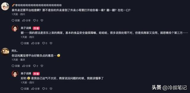 甚至一般路人,不管是提意见还是反馈问题,都一样要遭遇东哥“真爱粉”的无情冲击。有消费者在自己账号里发视频抱怨,点京东外卖吃到霉菌,要找客服理论。本以为同为消费者,大家都能理解他,给他支招。谁知评论区竟有一股为平台伸冤的势力:商家不老实,你找平台干什么?说得好,食品安全、假货山寨,都是行业共性问题,是小老板太贪了。但为什么偏偏只有你东哥,打出了品质堂食的口号呢?