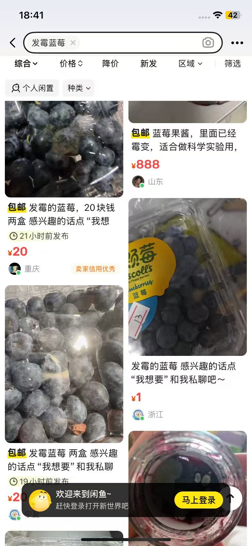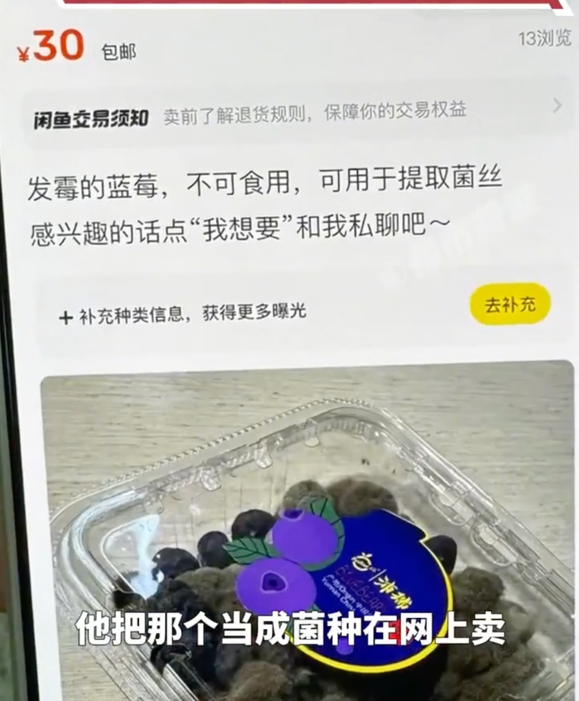 今天刷到个挺新奇的事,武汉一大学生随手买的蓝莓放在宿舍忘了吃,等想起来的时候,好家伙,整盒蓝莓全裹了一层青灰色的霉斑,凑近一闻酸一股臭味扑鼻。室友们都捏着鼻子喊:“扔了吧!再放下去宿舍都得长蘑菇了!” 结果这哥们儿硬是没听,直接掏出手机咔咔拍了几张发霉蓝莓的照片,转头就挂到二手平台,还明码标价 30 块,配文写着:“发霉蓝莓,不能吃!但能用来提取菌丝!”