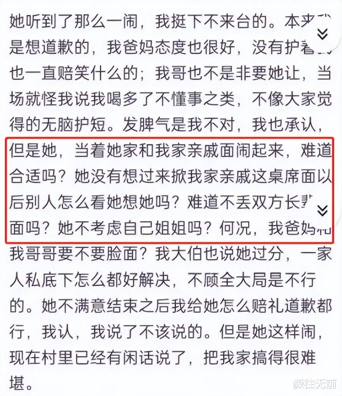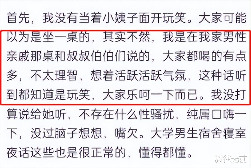 他说自己“没有当着女方妹妹的面说,是在自己叔叔伯伯那一桌上口嗨的,不存在什么性骚扰,无意间被她听去了,这才惹出一番事情。”