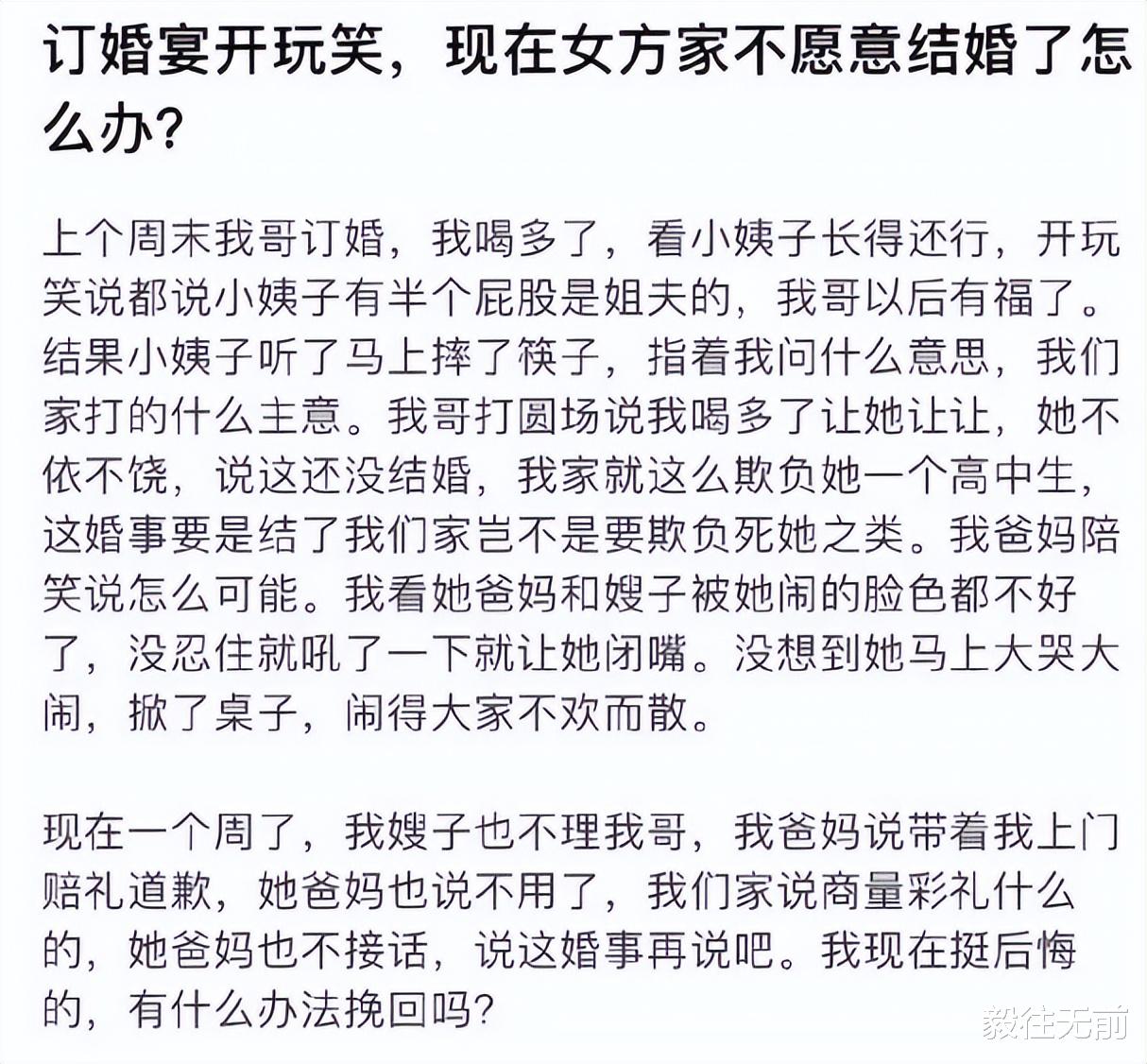 昨日,有个网友开了个帖子,题目是“因为开玩笑把我哥的订婚搅黄了”,询问大家自己最近遭遇的这事,发帖目的自然是希望大家支持他,可是很多人看了之后,反而大骂这个发帖人。