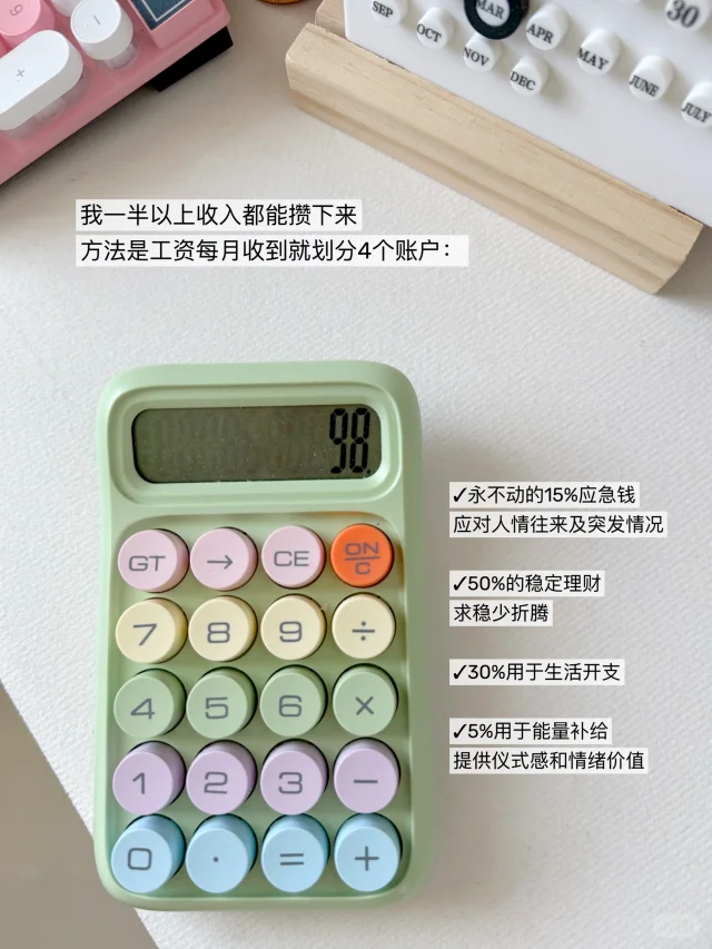 我一半以上收入都能攒下来,方法是工资每月收到就划分4⃣️个账户:永不动的15%应急钱,用于应对人情往来、尽孝及突发情况;50%的稳定理财,求稳少折腾。像我在JD金融买了黄金,有银行背书也是生活的稳定保障;30%用于一日三餐、话费日用等生活开支;5%用于能量补给,是自己做事奖励,提供仪式感和情绪价值,攒旅行基金等。