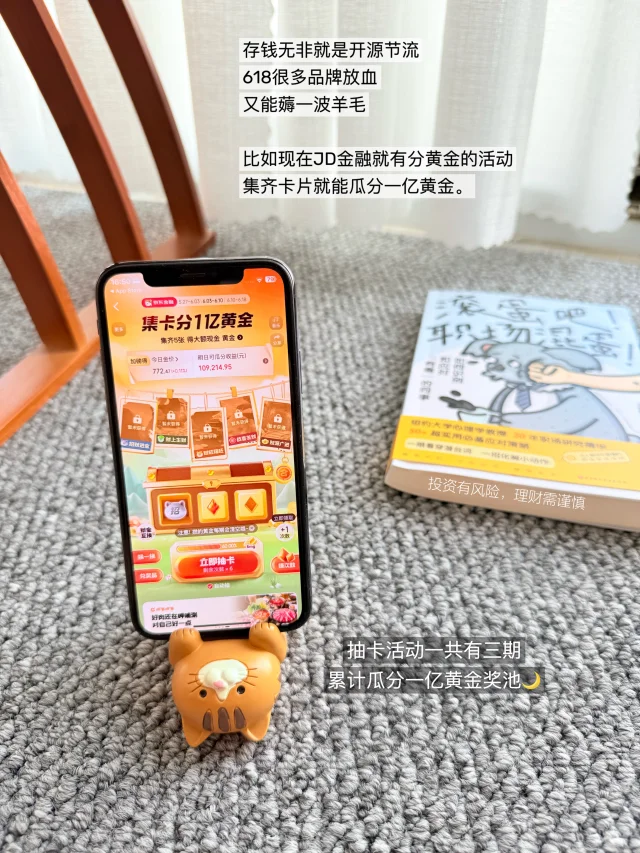 存钱无非就是开源节流:我和同事学会了卫衣买青岛、四件套买南通、袜子买诸暨、毛绒玩具买扬州等等。618很多品牌放血,比如现在JD金融就有分黄金的活动,集齐卡片就能瓜分一亿黄金,而且在抽卡过程中还有随机的黄金奖励。一边玩一边赚一边省,财运就这么一点点养起来了![哇R]