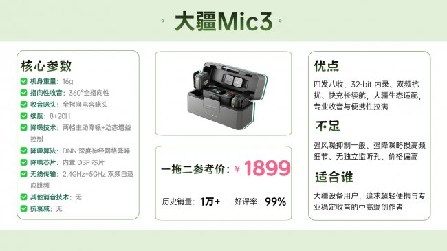 推荐理由:续航能力强,降噪可调,适合长时间多场景录制