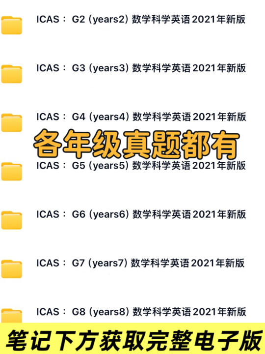 专为备考ICAS的孩子整理的2021年真题包来啦 数学、英语、科学三科全覆盖 从Year2到Year10全学段适配 高清PDF格式,一键保存就能打印,超省心~