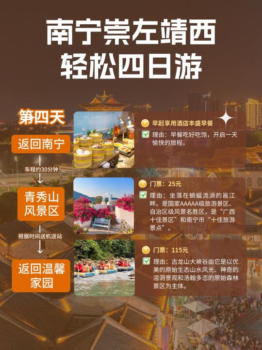 DAY4:南宁市区自由活动→ 赠送青秀山风景区门票(自行抵达)→ 游玩结束→ 专车送往机场或火车站