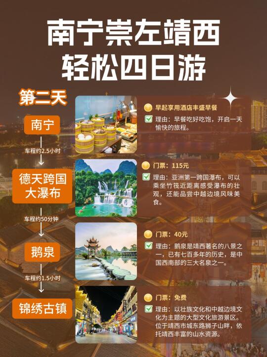 DAY2: 南宁酒店接 → 德天跨国瀑布(深度畅玩4h!)→ 鹅泉 → 住靖西酒店(夜游锦绣古镇🌌)