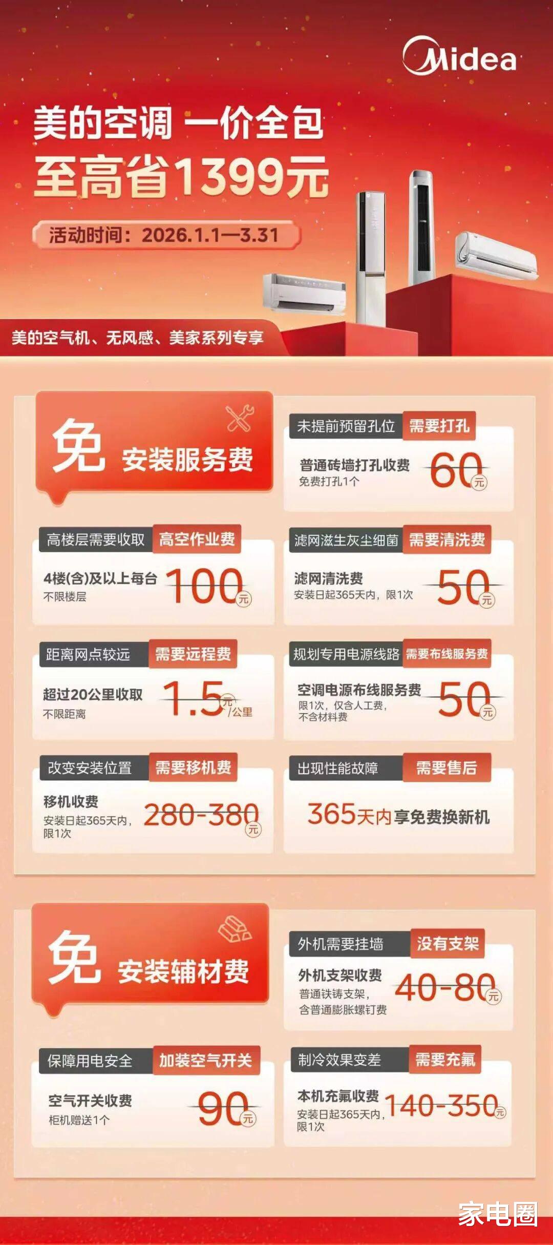 2026年开局即开战!空调市场迎来消费品以旧换新2.0政策红利与家装旺季需求集中释放的双重风口。但喧嚣之下,行业顽疾依旧刺眼:产品低价只是幌子,安装模糊多收费才是真相。高空作业费、打孔费、支架费、铜管费、空气开关费…… 各类名目层出不穷,消费者看似捡了便宜,最终却要为少则几百、多则上千元的额外费用买单,“买得便宜、用着更贵”已成顽疾。