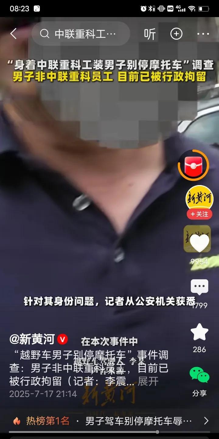 当初多嚣张,现在就有多狼狈。 据媒体报道,“嚣张哥”已经被行政拘留,本人对自己当时的不理智行为道歉,并表示自己并不是中联重科员工,只是以前和中联重科有业务往来,所以才有印有中联重科标记的体桖。 忽然有个疑问,这哥们开着几十万的车,估计也不是差钱的人,怎么不舍得给自己买件体恤衫呢,还穿着几年前的一个企业的工装,看来现在生意不好做啊,能省点是点。