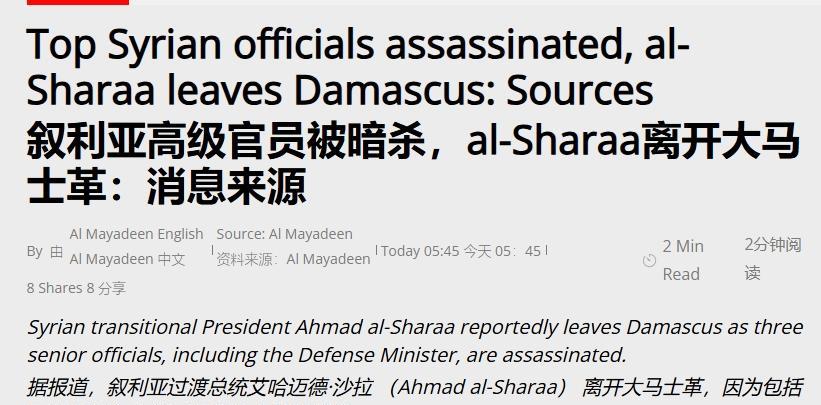 三名高官被杀,朱拉尼被吓跑了? 短短一天内,叙利亚局势可能已经发生了戏剧性变化。