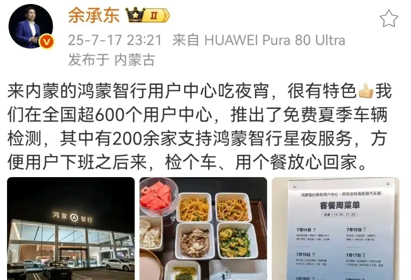 “鸿蒙智行大饭店”这个梗最近挺火。远的不说,就拿我买问界M9的广州南菱鸿蒙智行交付中心来说。 这个交付中心,是所有界都能卖的那种最早的旗舰店,广州好像番禺还有一家。 当时买车时接待我的销售经理是从凌志4S店过档鸿蒙智行交付中心,这类从BBA凌志过档的人员占大部分。 凌志的售后服务一直口碑就很好。 现在鸿蒙智行交付中心的服务只会比凌志更好。 广州南菱鸿蒙智行交付中心,展区大厅二楼就是餐厅和咖啡吧及影视休闲区,餐厅现在提供简单的自助餐,荤素十个左右菜品,有一款老火汤一款水果,管饱,还行。展厅及售后服务等待区茶水咖啡免费,免费洗车,免费充电,蹭空调! 维保检测偶尔去,感受还是不错的!