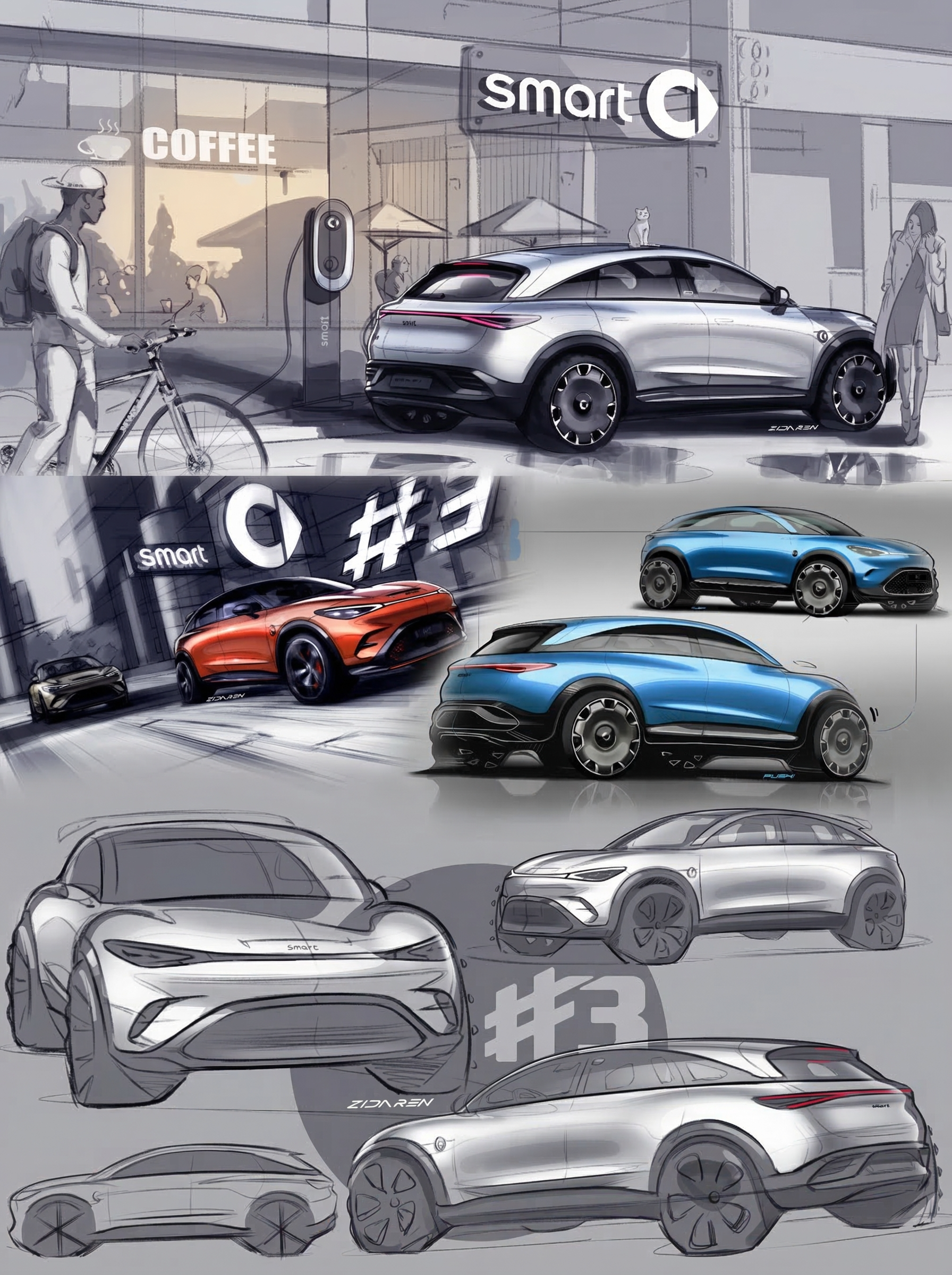 smart真的太懂年轻人了 四款手稿同框,每一款都戳审美,尤其是瓦格纳在奔驰的收官之作#6 EHD,更是精准踩中我的心巴。瓦格纳的“感性·纯粹”让奔驰更有温度,而smart的“感性·灵锐”,更是贴合年轻人的喜好,#1、#3软萌亲和,满是热爱;#5、#6凌厉利落,聚焦纯粹,#6作为首款掀背,线条凌厉不生硬,姿态大气又灵动,流体力学设计又美又实用,四轮四角兼顾灵动与舒适,日常代步、周末出游都合适,不套娃、有个性,这不就是年轻人想要的掀背吗