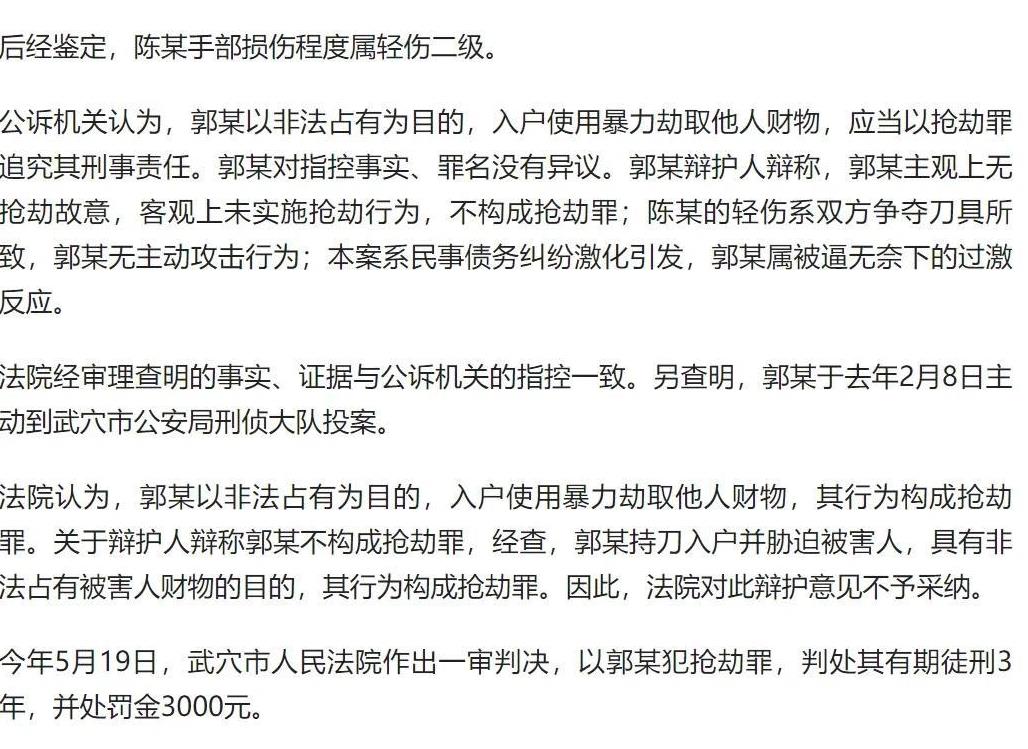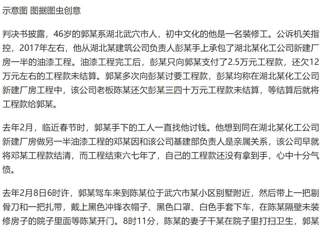 湖北武穴,男子承包了一个厂房油漆的工程,完工之后,他只拿到2.5万工程款,有大概12万工程款没有结清,这一拖就拖了7年,7年后,工人找他要钱,他无奈之下,就拿着一把刀到老板家中,要求给钱,不料老板妻子大喊救命,老板也不怕,直接过来抢刀,结局却让他后悔了。 据红星新闻,7月19日报道,去年过年前,郭先生的一个工人来找他了,他很为难,说家中实在困难,没有这笔工资,他们一家都不知道gai怎么过年了,说着说着声音就哽咽了。 郭先生看着自己的工人跟着自己风吹日晒,挣的都是辛苦钱,7年了,他还无法给工人结工资,想到这件事,他也很苦恼。 这件事要回到7年前,当时他承包了一个工厂一半的油漆工程,虽然只是一半的工厂,但这个工程量非常大,干完之后可以有15万左右的工程款。 他作为一名小包工头,能接到这样的工程,很不错了,他和工人们都拼命地干活,他们都是家中的顶梁柱,大家都想撒下更多的汗,拿到更多的工资,在大家的努力下,这个工程很快就完工了。 只是完工之后,事情并没有那么顺利,他的上一个承包大包工头,只能给郭先生2.5万元的工程款,还有12万左右不能结清,这个大包工头说,老板还欠他40万左右的工程款,所以要等这笔工程款结清之后,他才能结清那12万给郭先生。 郭先生只是一个小包工头,上面还没有结清,他着急也没用,他只好把具体情况跟自己的工人说了,让大家等一等,都理解一下。 好在郭先生的工人都能理解郭先生的难处,都没有去催他,这件事才一拖就拖了7年。 7年间虽然工人没有找过郭先生,但郭先生也是很着急的,他尝试要过工程款,但是都没有拿到。 直到郭先生的一个工人找到他,跟他说这工资已经欠了7年了,他要不是没钱过年,也不会过来要钱,他才着急了。 郭先生自然能理解自己工人的苦衷,他也觉得这笔钱不能再拖了,他承诺工人会尽快要回工程款。 送走工人之后,郭先生马上打听,他听说承包工厂的另一半油漆工程的小包工头,他和老板是亲戚,他早就拿到工程款了。 听到这个消息,郭先生坐不住了,他没想到这个老板这么欺负人,7年了还不愿意结清了12万的工程款。 他回到家左思右想,知道自己凭一张嘴巴去要工程款,是要不回来的,这一次想要回工程款,就得来硬的,毕竟已经7年了,他估计早就忘记了,或者想耍赖了。 于是他就拿着一把剃骨刀和一把扎带,来到老板陈某家,迎接郭先生的是陈某的妻子,从陈某的妻子口中,他知道陈某在家。 郭先生顺利进入陈某家,郭先生一进到他们家,陈某就从2楼走下来,郭先生也不装了,直接掏出一把剔骨刀,他跟陈某说:“你们自己把自己扎起来,我是来求财的,拿到工程款就走。” 陈某的妻子一看郭先生是这个架势,马上跑出屋外,大声呼喊救命,陈某也不怕事,下来就夺刀。 郭先生本就无心伤人,只是在争夺过程中,他还是伤到了陈某的右手,他抢到刀之后,就跑了。 只是这件事还没有结束,到晚上,村干部就让他去自首了。 那么郭先生的行为该怎么认定呢? 首先,郭先生的工程款被拖欠了。 《刑法》第276条规定:破坏生产经营罪;拒不支付劳动报酬罪是指,由于泄愤报复或者其他个人目的,毁坏机器设备、残害耕畜或者以其他方法破坏生产经营的,处三年以下有期徒刑、拘役或者管制;情节严重的,处三年以上七年以下有期徒刑。 7年了,陈某都没有支付12万的工程款,他的行为就已经构成了拒不支付报酬罪。 其次、郭先生来要工程款,其实可以走合法途径,但是他拿刀威胁就构成了抢劫罪。 《刑法》第263条规定,以暴力、胁迫或者其他方法抢劫公私财物的,处三年以上十年以下有期徒刑,并处罚金。 结合当时的情况,郭先生确实拿刀来求财,他的行为已经构成此罪,所以他被判有期徒刑三年。 郭先生要不到工程款,反而被判有期徒刑三年,他想想就觉得心里冤屈,也特别的后悔。
