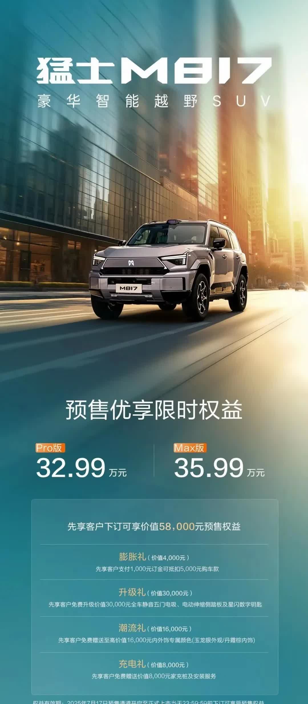 猛士817预售价格出来了啊,价格只有32.99万,这是预售价格,但是这个价格实际