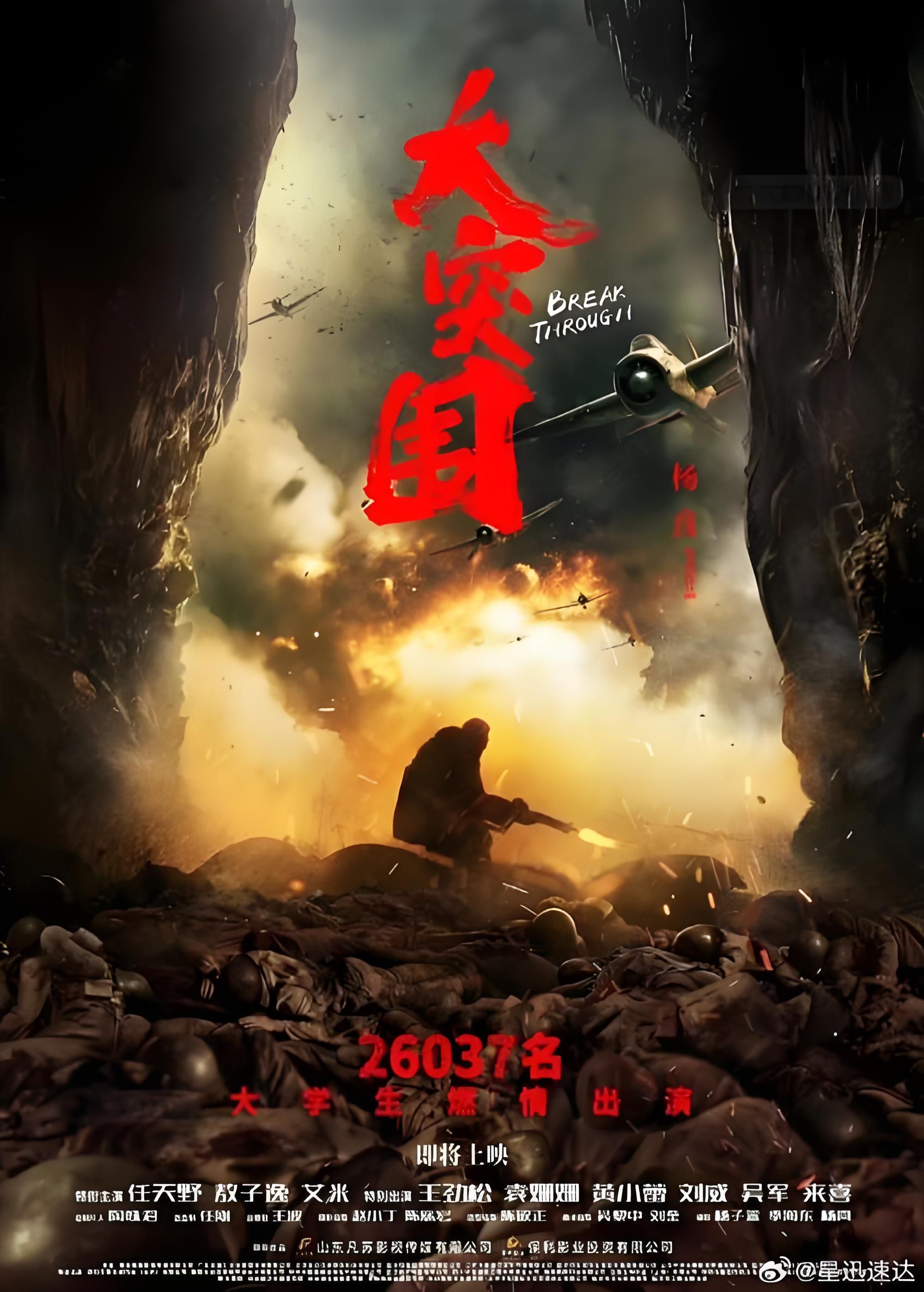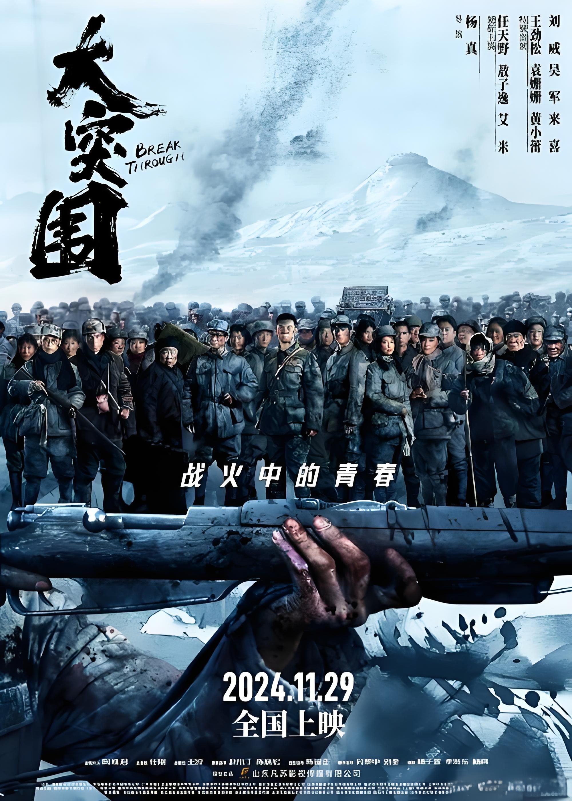 电影《大突围》是一部以中国抗日军政大学第一分校青年学员的视角展开的抗战题材电影,由杨真执导、编剧,任天野、敖子逸、王劲松、艾米等主演。该影片于2024年11月29日上映,是山东省“十四五”重点文艺创作项目和齐鲁文艺高峰计划重点项目。影片讲述了1941年11月中国抗日军事政治大学第一分校的师生们,在沂蒙山区生死突围的悲壮故事。17岁的新学员苏凡(敖子逸饰)从福建龙岩来到沂蒙山腹地的学校驻地报到,第二天就遭遇了日本军数万人的“铁壁合围”大扫荡突袭。在突围过程中,抗大教官杜青锋带领学员们奋勇抵抗,苏凡等青年学员在枪林弹雨中经历了生死考验,逐渐成长为真正的战士。抗大校长周纯全也在艰难时刻指挥若定,稳定军心。电影投资2.5亿元,主要在费县、平邑等地拍摄。为了保障电影品质,剧组搭建了37个大型实景,制作道具超过十万件。电影雇佣了2.6万的群演演员,都是大学生,他们每天能有80块钱的收入,食宿全包,还可以在实习证明上盖章签字。影片全国上映以来,好评如潮,获得热烈反响,观众纷纷点赞。“真实还原,迸发震撼人心的力量”,电影还原了发生于1941年11月的大青山突围战,真实再现了抗大一分校师生们,在日军疯狂围剿下,浴血抗敌,完成胜利突围的悲壮历史。