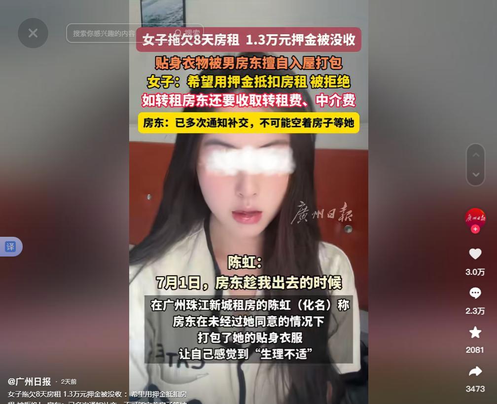 7月12日报道,广东广州,因女租客拖欠8天房租,男房东多次催要未果,扣了女租客1