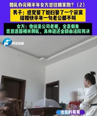 河南新乡,男子给了新婚妻子101,000元现金,128,000元彩礼,还有五金,可妻子刚结婚半年,就老往娘家跑,把他当取款机,让他去挣钱,分一半钱给她花,还不领证,说等有了孩子再领,先玩一年再说,半年也没有叫过他一声老公,他去找妻子,妻子却说:结婚前,他就装得有多有钱,实际上这都是假的。 7月20日小莉帮忙报道,魏先生一提起自己的新婚妻子,就很心酸,结婚半年了,他跟妻子还不是法律上的夫妻,妻子不愿意跟他领证,还跟他说,要等有了孩子再领证,还有先玩一年再说。 可他们结婚半年了,妻子一直没有怀孕,更让他心酸的是,有钱妻子就跟他回家,没钱妻子就回娘家,简直就是把他当提款机。 妻子跟他说了,要他出远门挣钱,挣到的钱要分她一半,还要哄她开心,她开心了就可以跟魏先生出远门,才会跟魏先生回家。 这日子,魏先生没有半点幸福可言,这可是他花了20多万娶回来的妻子啊,可妻子连一声老公都不愿意喊他,现在还不愿意回家了,这日子他不知道到底还能不能过下去。 他找来调解员,跟调解员说,他感觉娶了妻子,就感觉娶了一个祖宗,除了把他当提款机,妻子对他毫无感情。 他说,如果妻子想好好过日子就回来好好过日子。如果不想过日子了,那就把那20多万,还有结婚的五金退回来。 可是当妻子听到魏先生的说辞时,她却委屈了。 她说,他们俩是经人介绍认识的,当时魏先生跟媒人说,他是多有钱,多有钱,反正就是装大款,不但跟媒人说,还跟所有的人说。 她当时看到魏先生只是跟父亲一起住,家庭也不复杂,魏先生又有本事,她觉得跟着这样的人过日子,不会吃苦头,所以她才跟魏先生结婚的。 结婚之后,她想着魏先生有钱,还愿意拼搏,她就在家里享福,不是打游戏,就是看电视剧,日子过得还算潇洒。 可是魏先生就是看不惯她,她跟魏先生一起去北京,她是吵着哭着回来的。 现在他们过不下去了,魏先生要求妻子返还彩礼,以及现金101,000元,还有五金也需要退回。 妻子也说了可以走法律途径,该退回多少就退回多少。 看到魏书生和妻子的婚姻,让人唏嘘不已,他们一个装大款,一个想拜金,妻子看魏先生有钱了就跟他过,没钱了就要说再见,把婚姻当儿戏,实在是不应该。 魏先生也从一开始就装大款,欺骗了妻子,以这样的方式娶到妻子,更是不应该。 这样的婚姻在平常人看来,它能够长久才是奇怪的事情。 首先、婚姻的本质是两个人共同过日子,要相互扶持,相互理解,相互关爱,才能好好过日子。 《民法典》第1043条规定:家庭应当树立优良家风,弘扬家庭美德,重视家庭文明建设。夫妻应当互相忠实,互相尊重,互相关爱;家庭成员间应当敬老爱幼,互相帮助,维护平等、和睦、文明的婚姻家庭关系。 但是魏先生一开始欺骗妻子,妻子也好吃懒做,没钱就不过日子了,这样的婚姻确实不能长久。 其次,妻子如果不想过日子了,那么她是应当退还现金,彩礼以及五金的。 《关于适用<民法典>婚姻家庭编的解释(一)》第5条规定:当事人请求返还按照习俗给付的彩礼的,如果查明属于以下情形,法院应当予以支持: (一)双方未办理结婚登记手续; (二)双方办理结婚登记手续但确未共同生活; (三)婚前给付并导致给付人生活困难。 他们才结婚半年,在一起共同生活时间比较短,妻子需要退回大部分的钱财。