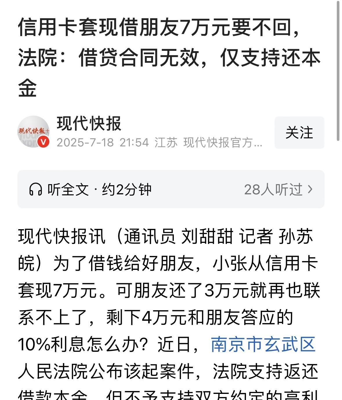 江苏南京,一好兄弟管男子借钱,男子手头也不宽裕,但不借又觉得面子过不去,他就打脸充胖子,从信用卡里套现7万借给了朋友,对方感动了,说一定还款日前归还本金,并按年利率再给男子10%的利息。谁知,朋友还了3万后就人间蒸发了,男子东拼西凑把借款还完后,直接诉至法院,要求朋友还剩余本金加承诺好的利息,结局悲剧了! 小张和小王,是多年的铁哥们儿,平日里称兄道弟,有啥事儿都互相照应着。 这两人关系好得没话说,走哪儿都一块儿,在大家眼里那就是“有福同享,有难同当”的典范。 有一回,小王突然就遇到了难处,手头一下子紧巴巴的,连日常开销都成了问题。 一时整不到钱,他心里很着急,思来想去,他就想到了好兄弟小张,觉得小张肯定会帮他一把。 于是,小王就去找小张江湖救急了。 小张这边呢,其实手头也不怎么宽裕。他每个月那点工资,除了日常开销,也剩不下多少。 可看着小王那副愁眉苦脸、着急上火的样子,再想想这么多年的兄弟情义,小张心里就犯难了。 要是拒绝吧,觉得对不起兄弟,面子上也过不去,可要是答应吧,自己又实在拿不出那么多钱。 在“兄弟情义”和“面子问题”前,小张还是选择了要面子,他一咬牙,心一横,决定帮小王这个忙。 他灵机一动,想到了自己信用卡里还有额度,就从POS机里套出了7万块钱,然后借给了小王。 小王拿到钱的时候,感动坏了,拍着胸脯跟小张保证,一定在信用卡还款日前把本金还上,还同意按年利率10%给小张支付利息。 小张看着小王信誓旦旦的样子,心里也踏实了不少,觉得这兄弟靠谱,没白交。 然而,事情并没有像他们想象的那么顺利。 信用卡还款日一天天临近,小王一开始只还了3万块钱。 就在小张等着他还剩下的钱的时候,小王就像人间蒸发了一样,没了音讯和踪影。 电话打不通,人也找不到,把小张急得像无头苍蝇似的。 小张看着银行发来的账单,那上面的数字,看得他心烦意乱。 每天增长的利息,就像一个无底洞,小张没办法,只能四处东拼西凑,跟这个朋友借点,跟那个亲戚要点,好不容易才把信用卡的借款给还上了。 还完钱后,小张也是彻底心寒了,他觉得小王太不仗义了,自己这么帮他,他却这样坑自己。 一气之下,小张一纸诉状把小王起诉到了法院,要求小王归还剩下的4万块钱借款本金,并且按年利率10%支付利息。 那么,从法律角度,该怎么看待这个案子? 《最高人民法院关于审理民间借贷案件适用法律若干问题的规定》第13条规定:具有下列情形之一的,人民法院应当认定民间借贷合同无效:套取金融机构贷款转贷的…… 小张自身手头并不宽裕,却为了帮助小王,通过从POS机套取信用卡内7万元资金的方式,将套取的金融机构贷款转手借给了小王。 这种行为本质上属于套取金融机构信贷资金后又高利转贷给借款人,严重扰乱了金融管理秩序。 从法律层面看,金融机构发放信用卡是基于对持卡人信用状况和还款能力的评估,旨在满足持卡人合理的消费等资金需求。 而小张将信用卡资金套现后用于出借,改变了资金的合法用途,使得金融机构无法有效监控资金流向,增加了金融风险。 法院依据这个法条,认定小张和小王之间的借款合同无效是合理且必要的。 合同无效意味着双方基于该合同所设定的权利义务,如约定的年利率10%的利息条款等,不受法律保护。 法院最终判决,小王必须把剩下的4万块钱借款本金还给小张,但是那10%的利息就不予支持了,因为法律不保护这种“转贷”行为。 站在小张的角度,他肯定觉得自己血亏了,但法院的认定,既维护了金融市场的稳定和安全,也防止了不法套现转贷行为获取非法利益,对规范民间借贷市场起到了积极的引导作用。 《民法典》第157条规定:民事法律行为无效、被撤销或者确定不发生效力后,行为人因该行为取得的财产,应当予以返还;不能返还或者没有必要返还的,应当折价补偿。有过错的一方应当赔偿对方由此所受到的损失;各方都有过错的,应当各自承担相应的责任。法律另有规定的,依照其规定。 由于小张和小王之间的借款合同被法院依据前一条法条认定为无效,根据本条法律规定,双方基于无效合同所取得的财产应当进行相应的处理。 小王因该无效借款合同从小张处取得了7万元借款,在已经偿还3万元后,剩余的4万元借款本金属于因无效合同取得的财产,应当返还给小张。 所以法院判决小王把剩下的4万元借款本金还给小张,符合该法条关于无效民事法律行为财产返还的规定。 而对于双方约定的年利率10%的利息,因为借款合同无效,该利息条款也不受法律保护,小王无需按此利率支付利息。 小张拿到判决结果后,心情复杂,他没想到,自己一片好心帮兄弟,最后却落得这样的下场。 这兄弟情义,在金钱面前,怎么就变得这么脆弱了呢?这场因为兄弟情义引发的“糊涂账”,真是给小张上了一课。 对于小张的遭遇,你有什么看法?