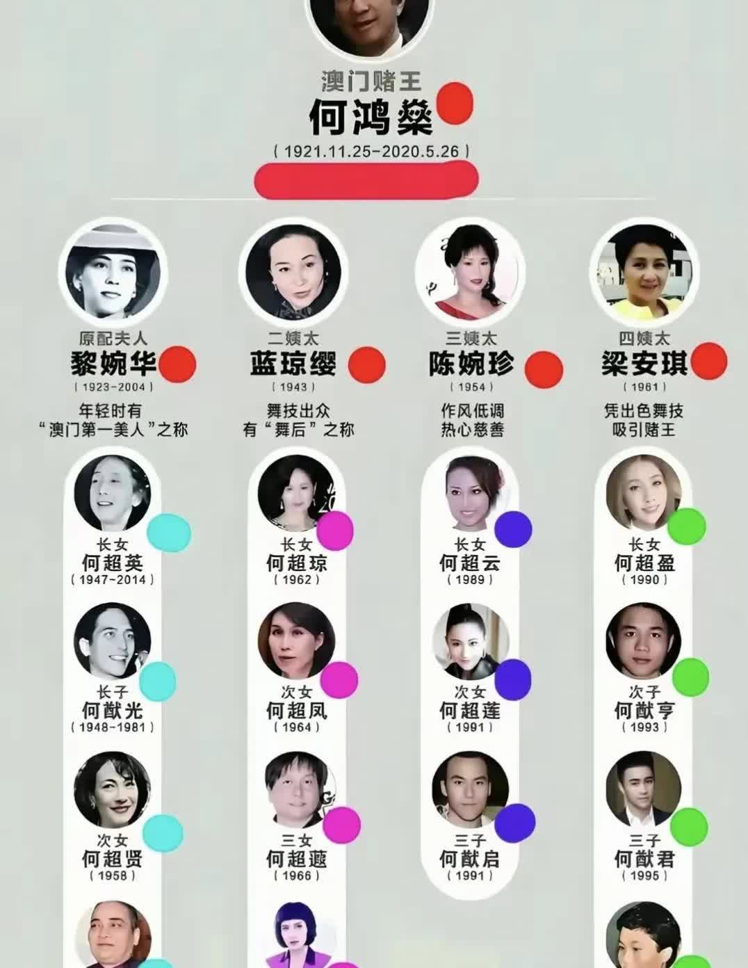 “赌王”何鸿燊绝对是一个“管理大师”,他有四房太太,17个儿女,每位太太都有独立的住所,如家族有重大活动时,何鸿燊会提前规范流程,减少太太们的正面接触。 大太太黎婉华由于长期身体不好,很早就退出事务管理,四个儿女基本上被边缘化。 二太太蓝琼缨是何超琼之母,是何鸿燊的社交商业助手,早期统领北美赌场业务。 三太太陈婉珍是护理出身,负责医疗养老投资,调和各房矛盾,在各房中是最低调的。 四太太梁安琪是何鸿燊后期的商业助手,主导澳门新项目。 四房之中主要是二房和四房之争,在2020年何鸿燊去世后,二房的何超琼成为家族核心,四房退守澳门业务,三房保持中立,大房被边缘化。