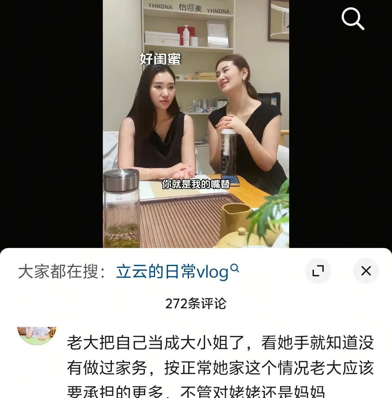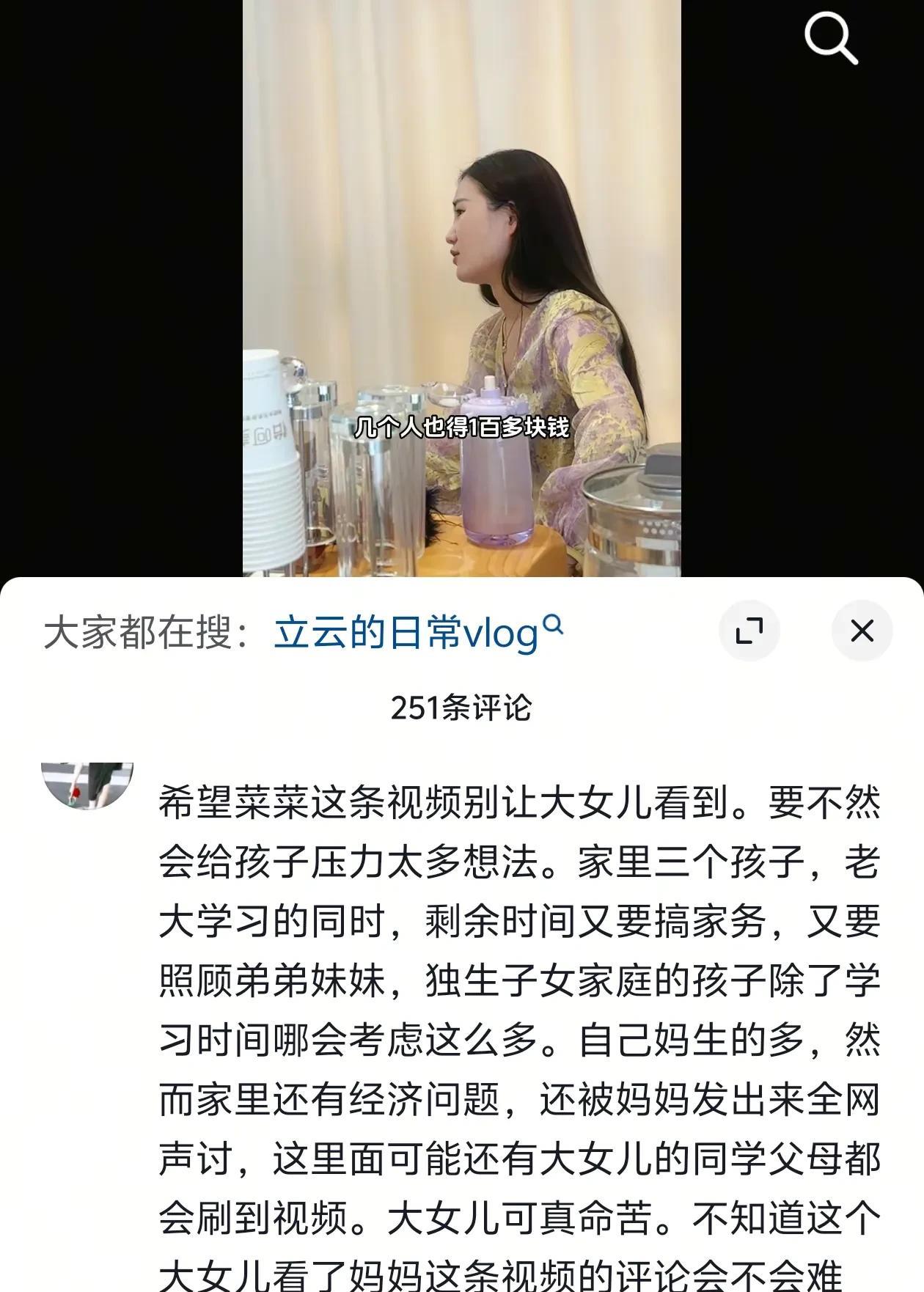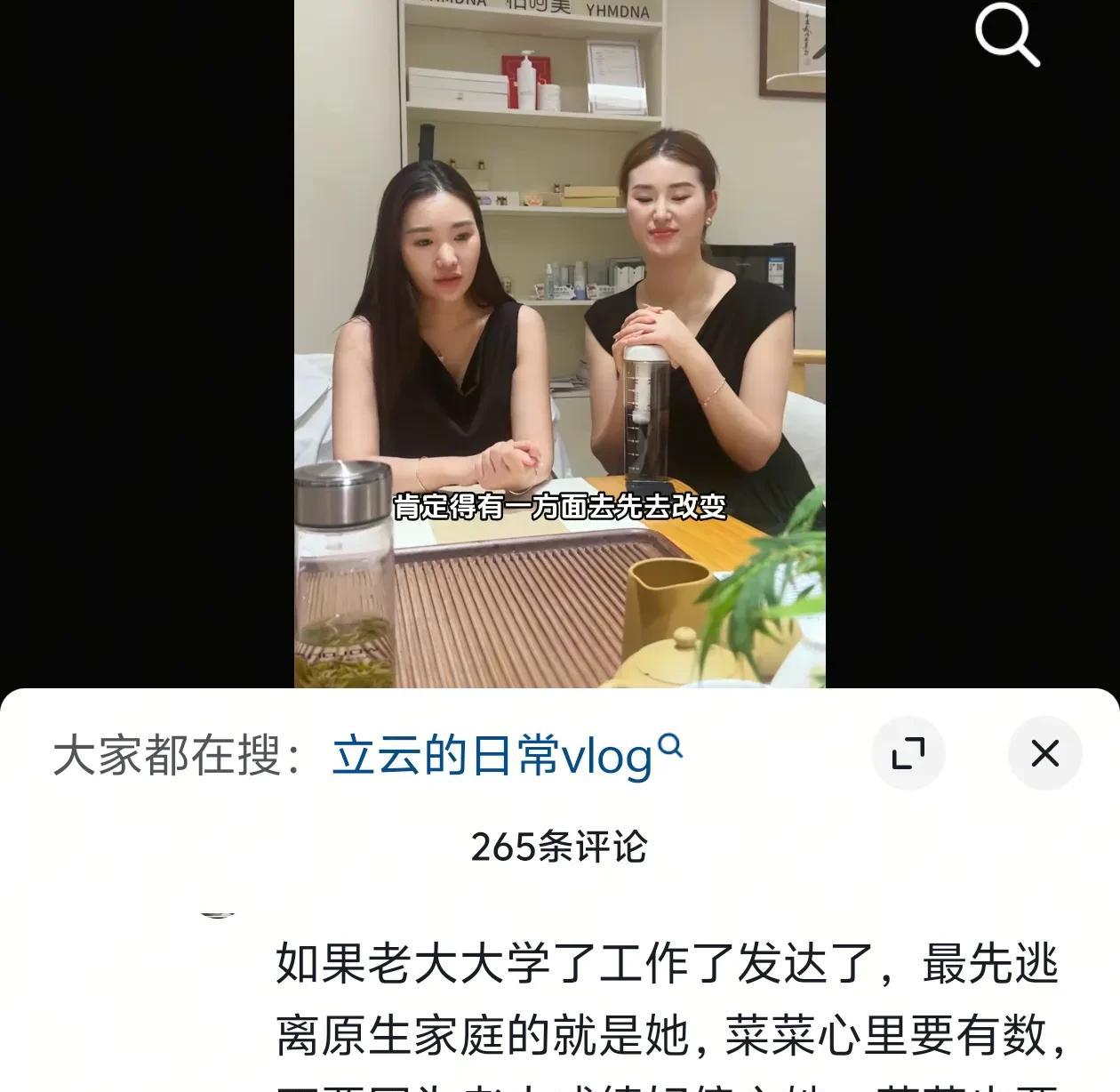 立云真是菜菜生命中的贵人,作为一个婆家堂妹,帮助菜菜买房买车,这又帮助教育孩子,几乎是承担了立云堂哥的责任[捂脸][捂脸] 立云以姑姑的身份训菜菜家女儿,起因是俩姑娘小的初中大的高中,放假衣服还让妈妈洗,不做饭外卖。让网友破防的是菜菜大女儿,挨批的时候还笑嘻嘻的,网友从视频里这个孩子一贯的表现总结出来她自私不懂事儿,网友们觉得孩子的表现与“穷人的孩子早当家”这句话相悖。如果一个人对大女儿有看法,可能是个人偏见,可是几乎所有人都这个观点,那这孩子就要反思反思自己了。 没有公主命却有公主病,其实不止菜菜女儿自己,立云的妹妹当初不也是要出去租房、嫌每月2000块的生活费不够花、抱怨20块一斤的草莓不舍得吃么[捂脸][捂脸][捂脸]
