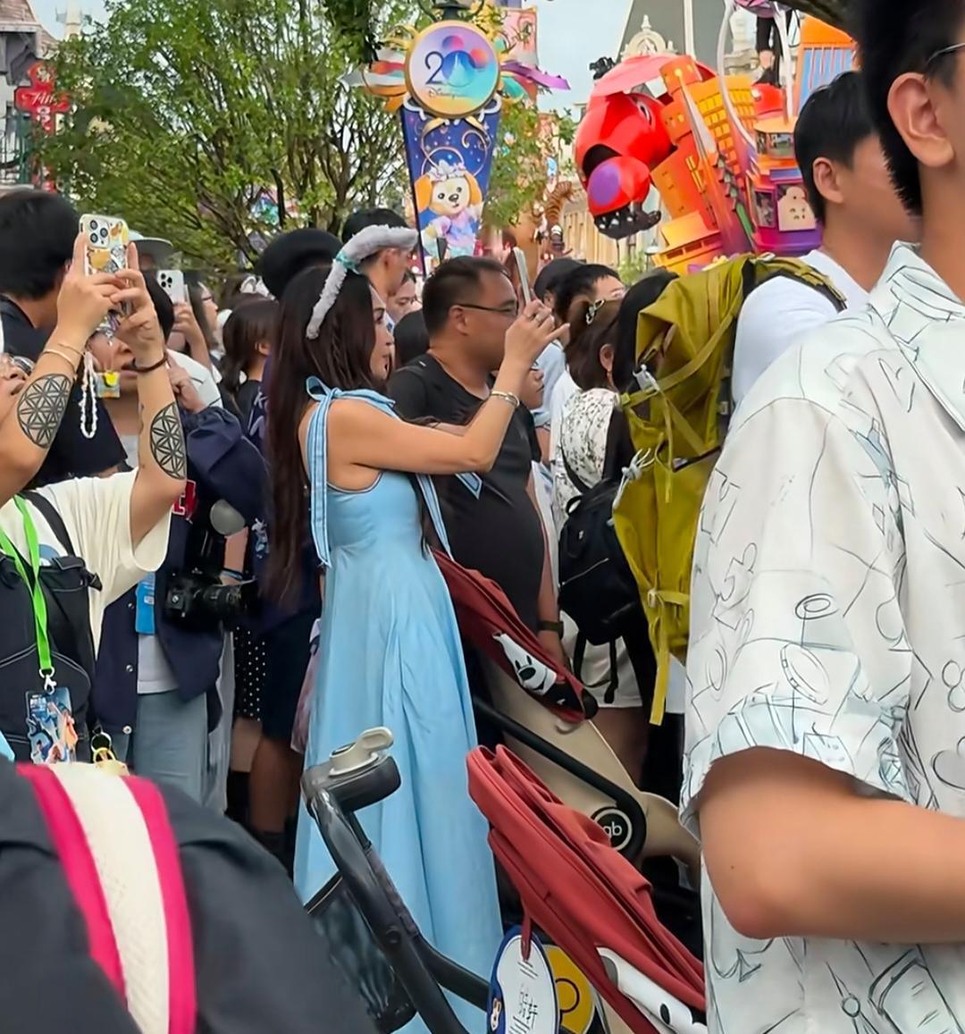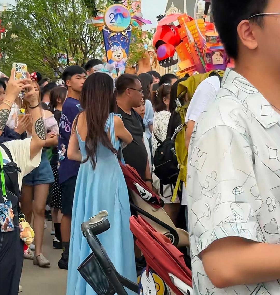 温碧霞在香港迪士尼乐园游玩,她穿了一条蓝色裙子,打扮像少女,状态看起来真好!