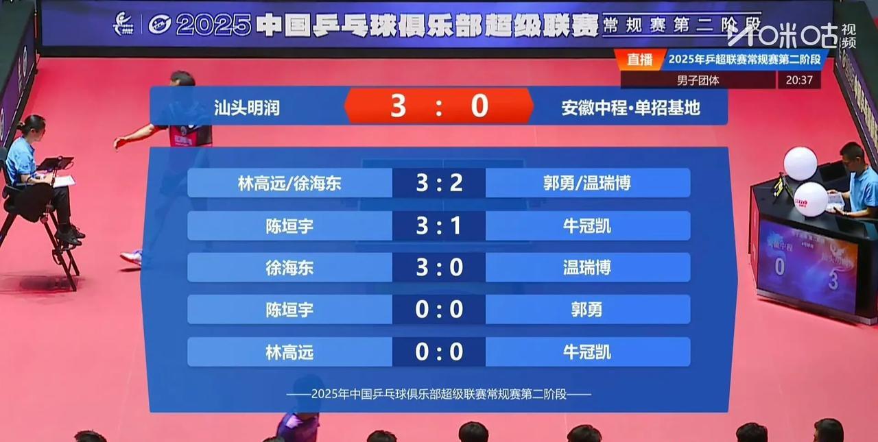 2025乒超联赛第二阶段男子团体: 汕头明润三比零安徽中程 林高远徐海东3比2温瑞博郭勇(-14,6,9,-8,9) 陈垣宇3比1牛冠凯(-7,8,4,7)