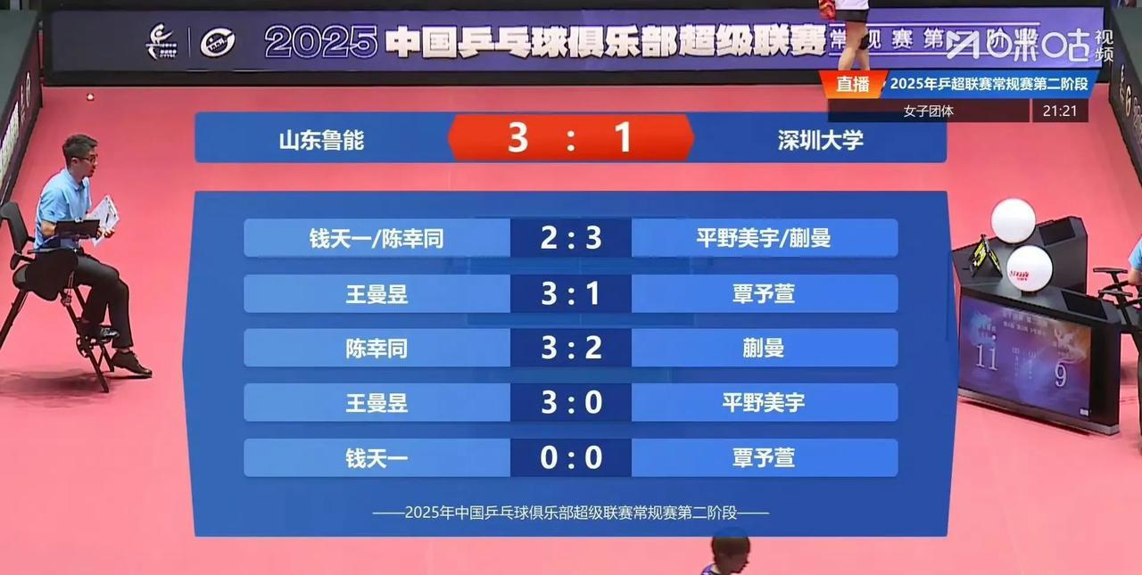 2025乒超联赛第二阶段女子团体: 山东鲁能三比一深圳大学 王曼昱两分 陈幸同钱天一2比3蒯曼平野美宇(3,9,-9,-9,-9) 王曼昱3比1覃予萱(7,6,-7,6) 陈幸同3比2蒯曼(9,-4,-2,9,6)