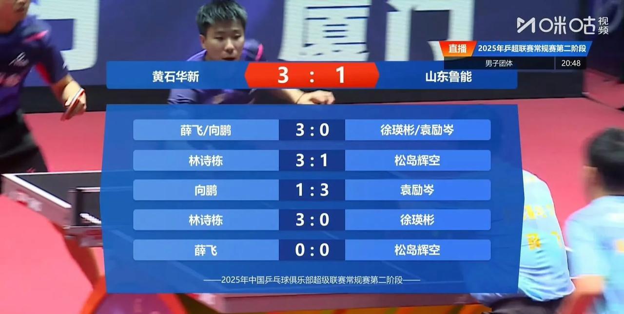 2025乒超联赛第二阶段男子团体: 黄石基地三比一山东鲁能 林诗栋两分 薛飞向鹏3比0徐瑛彬袁励岑(7,7,13) 林诗栋3比1松岛辉空(12,-12,5,9) 向鹏1比3袁励岑(-9,-8,6,-8)