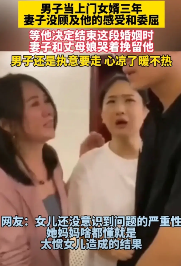 男子当上门女婿三年 妻子没顾及他的感受和委屈 等他决定结束这段婚姻时,妻子和丈母娘哭着挽留他 男子还是执意要走,心凉了暖不热 人心不是一天凉的,树叶不是一天黄的,能忍他三年也不错了,好样的,兄弟。得有多失望才让自己的心放下你们这个家,心一旦凉了,在怎么捂也不会热了,哀大莫过于心死。现在知道后悔了,当初的冷眼相待,也从不关心自己男孩的感受,现在不管是丈母娘还是女孩子,你也无法让一个男孩子回头,也可以说是结束了这段姻缘,以前的冷眼相待,可以对你服从,但现在的冷眼相待,换来的却只是一颗冰冷的心啊