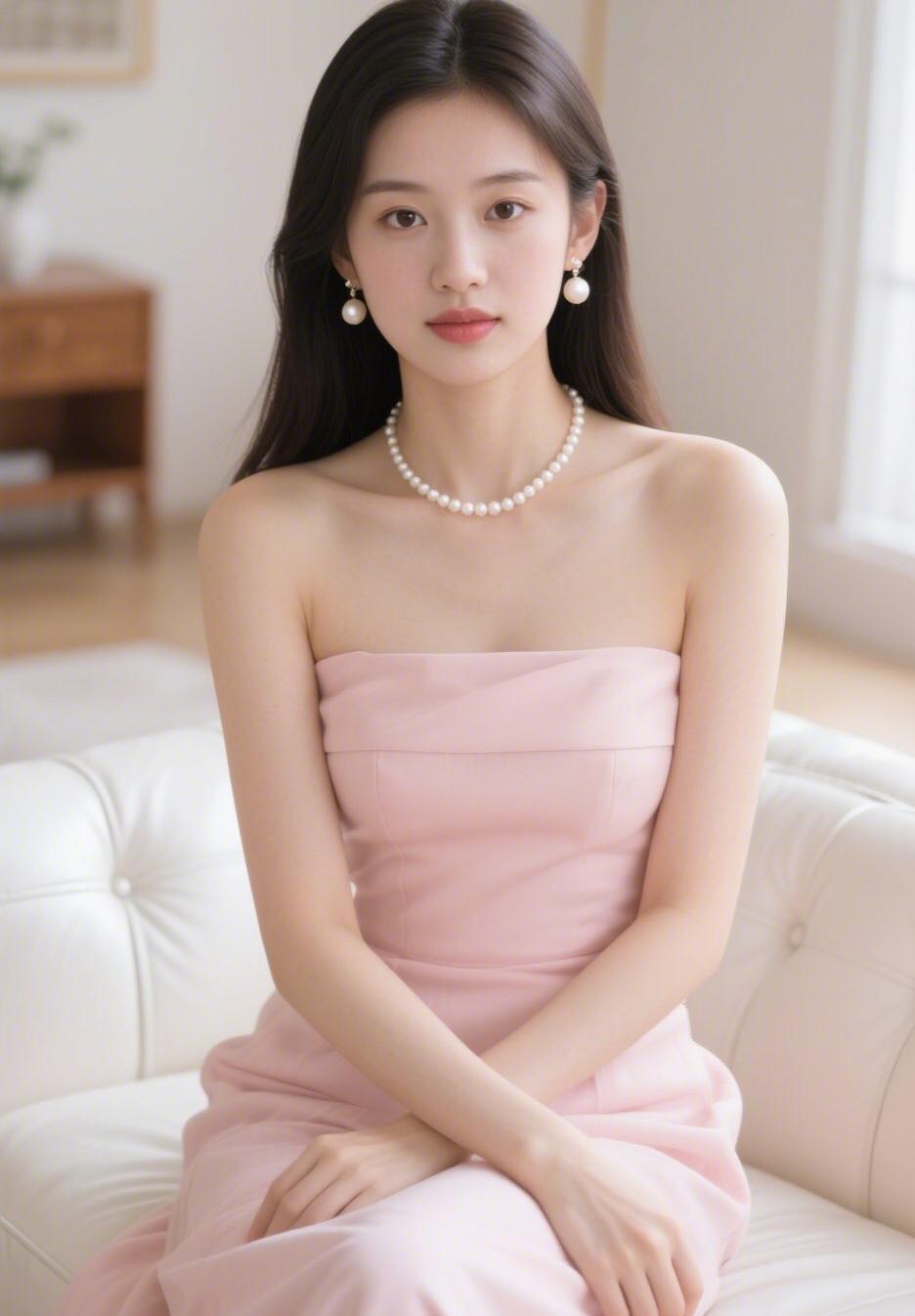 优雅粉色礼服,珍珠配饰,温婉动人。