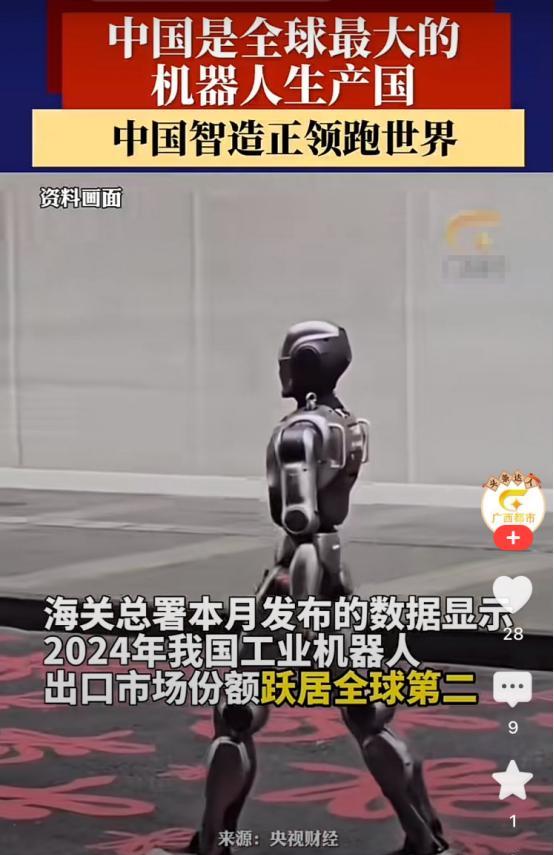 中国智造正领跑世界!近日,中国已超越美国成为全球最大的机器人市场和生产国,有望转变成最具创新力的机器人技术发展地。 最近这些年,中国在机器人这块儿的发展真是越来越猛,现在不光成了全球最大的机器人市场,连生产数量也超过了美国,说不准以后还能成最有创新力的机器人技术地呢。 2024年的时候,首届中国人形机器人产业大会发布了一份报告,里面说2025年咱们国家人形机器人的市场规模大概能有53亿元,等到2029年,可能就涨到750亿元了,到那时候能占全世界总量的三成多。 而且咱们国家已经连续 11 年都是全球最大的工业机器人市场,2024 年一年就生产了 55.6 万套工业机器人,比前一年多了 14.2%。再看企业数量,到2024年年底,全国有 45 万多家智能机器人产业企业,注册资本加起来有 6 万多亿元。 跟 2020 年底比,企业数量涨了两倍还多,就算跟 2023 年底比,也涨了快两成,这增长速度真是够快的,这么多企业扎堆做机器人,市场能不热闹吗? 现在机器人不光能听明白人的话,还能感知周围的环境,就跟长了眼睛耳朵似的,以前那些关键的零件,像减速器、控制器这些,咱们自己也能做得越来越好了。 不管是工厂里用的焊接、喷涂机器人,还是医院里用的手术、物流机器人,性能和安全程度都在不断提高,到 2024 年 7 月,咱们国家机器人相关的有效专利有 19 万多项,差不多占了全世界的三分之二。 产业能发展这么好,政策和资金也帮了大忙,2023 年 11 月,工信部发了个《人形机器人创新发展指导意见》,说要到 2025 年把人形机器人的创新体系搭起来,把关键技术攻下来,保证零件能供上。 重庆、深圳这些地方也跟着出台政策,支持企业研究相关技术,还给钱帮忙,投资方面就更不用说了,2025 年以来,机器人行业融资特别火,光 6 月之后,就有十多家做成人形机器人的企业拿到了上亿的投资。 好多投资机构都盯着这个领域,地方上也打算成立产业基金,引导更多钱投到机器人身上。从零件生产到机器人制造,再到后面的销售服务,整个产业链都挺完整的,大家各司其职,配合得还挺好。 机器人发展好了,对咱们普通人来说好处可不少,现在好多人家都有家政机器人了,扫地、拖地、擦窗户这些活儿,它们能干得明明白白,省得咱们自己费劲。 在医疗健康方面,机器人也派上了大用场,有些老人或者因为生病腿脚不方便的人,穿上外骨骼机器人就能慢慢锻炼走路。 重庆有个医疗科技公司做的外骨骼机器人,能通过传感器知道人想动,然后帮着使劲,让人走得更稳、更有劲儿。 平时想找点乐子,机器人也能陪着,现在好多年轻人喜欢 “遛机械犬”,在社交平台上这个话题的播放量都过亿了。 那些 AI 宠物就跟真的一样,能一直陪着人,帮着排解孤独,有个叫 “哮天” 的机器狗,才 850 克重,能听懂人的话,坐下、跳、跳舞都会,还能用手机、遥控器控制,玩着可有意思了。 其实在平时生活里,到处都能看到机器人的影子,去餐厅吃饭,经常能看到送餐机器人在桌子之间穿梭,把菜准确地送到客人面前,又快又新鲜。 住酒店的话,机器人可能会在门口迎接你,还能帮你送外卖,逛商场的时候,导购机器人能告诉你商品在哪儿,解答你的疑问,找东西方便多了。 工厂里就更不用说了,到处都是工业机器人在忙碌,搬运东西、分拣货物、检查产品质量、拧螺丝、装零件,这些活儿它们干起来又快又好。 宁波极氪的 5G 智慧工厂里,有个人形机器人,在工位上帮着工人搬东西,做得还挺像样,这在国内还是头一回。 煤矿里也用上了机器人,中信重工做的履带式辅助运输机器人和喷浆机器人,不用烧油,在那些又小又危险的地方也能干活,既减轻了工人的劳动强度,又提高了效率和安全性。 咱们国家的机器人产业真是越来越强了,不管是市场规模、技术水平,还是整个产业的生态,都在往上走。 这些机器人不光让工厂生产更有效率,也让咱们的生活越来越方便、越来越舒服,从家里的日常琐事,到医院的看病治疗,再到出门逛街、旅游,机器人都在悄悄帮着咱们。 以后随着技术越来越进步,机器人肯定还会在更多地方发挥作用,让咱们的日子过得更滋润。 说不定再过几年,咱们的生活里到处都是机器人的身影,那时候又会是啥样呢?