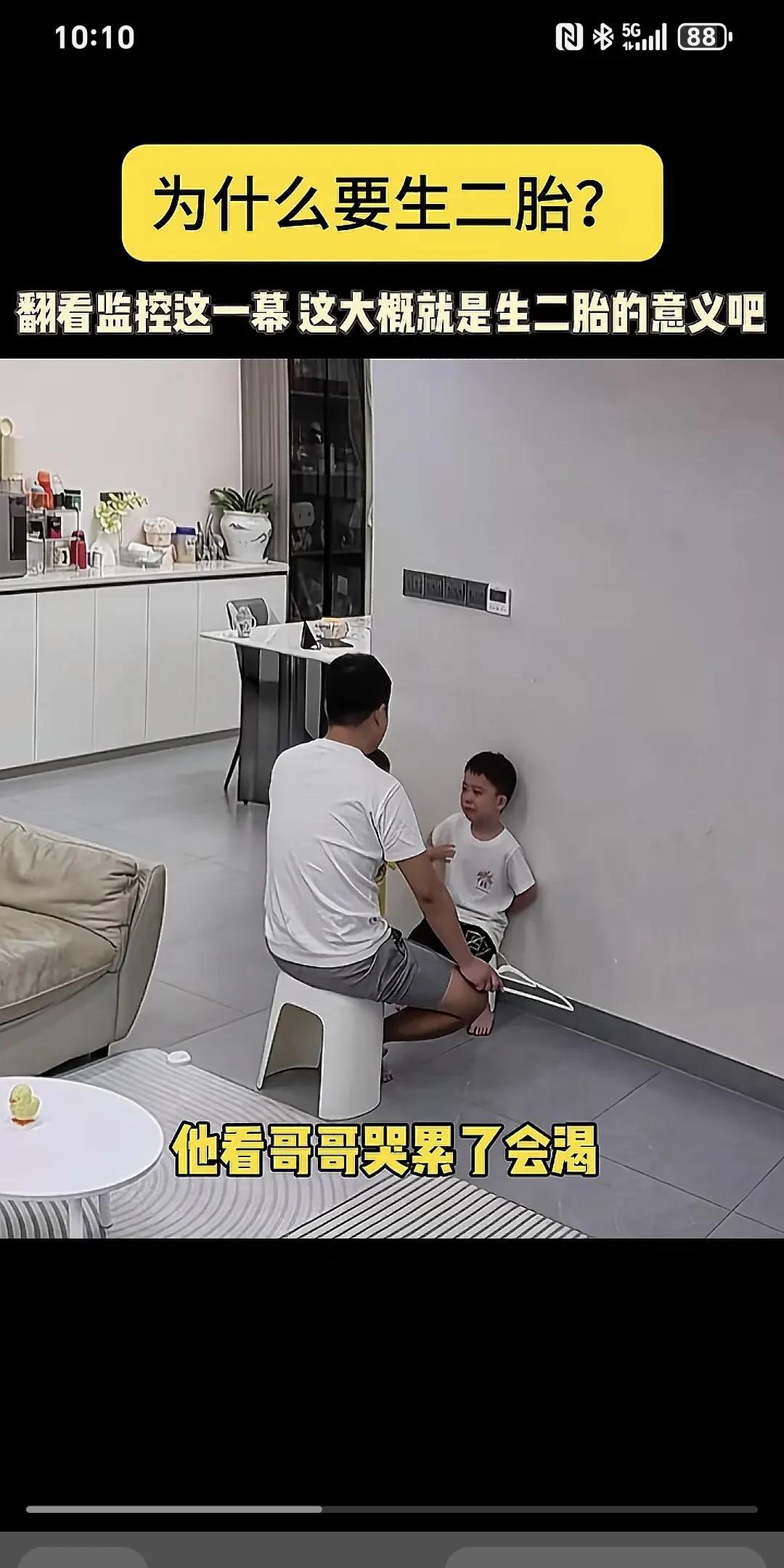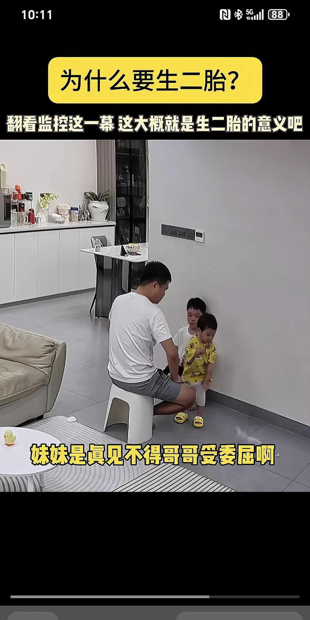 为什么要生二胎?翻看监控的这一幕,这大概就是生二胎的意义吧~ 爸爸正在教育哥哥,没想到妹妹竟然这样做...这大概就是生二胎的意义吧! 爸爸正在教育哥哥,妹妹竟然这样做,她怕爸爸站累了,拿了张凳子过来示意爸爸坐下,紧接着又给了张凳子让哥哥也坐下,委屈的哥哥有点无措,看爸爸没说话就尴尬的坐下了,没想到妹妹竟然...他看哥哥哭累了会渴,又端来了杯水给哥哥喝,哥哥此时内心五味杂陈,爸爸却有点摸不着头脑,妹妹又拿来自己的零食给哥哥吃,当看到爸爸手里拿的衣架后,直接上前打下了爸爸手中的衣架,妹妹是真见不得哥哥委屈呀,谁叫女儿是爸爸贴心的小棉袄,爸爸的心都被女人暖化了?安慰完爸爸又来安慰哥哥,直接拉起哥哥的手就准备走,没想到做这么多就是为了带哥哥走,这就是生二胎的意义吧! 好家伙,阳奉阴违,调虎离山,围魏救赵,声东击西,3岁用了36计的4计。这劝架的最高境界,一句话没有就解决了。 为什么老二讨人喜欢,因为他在父母管教老大的过程中学会了怎么避雷,学会了察言观色,学会了如何讨喜,所以老二往往很机灵,老大因为没有人给他做铺垫,所以总是一个人跌跌撞撞,其实,老大是最孤独的,也是最可怜的。 妹妹递的不是凳子、水和零食,是把‘爱’掰成了三份:给爸爸的体谅,给哥哥的心疼,还有属于她小世界里最纯粹的护短[比心][比心][比心]#懂事善解人意的妹妹#
