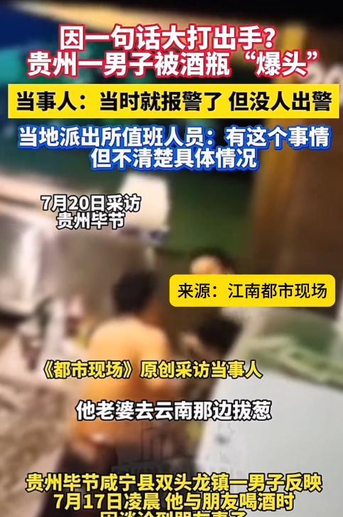 [微风]“开不起玩笑?”近日报道,贵州毕节,一男子和朋友聚餐,朋友提及妻子在云南“拔葱”,男子插嘴:“我也有好兄弟在那拔葱!”谁知话音未落,朋友酒瓶已砸上头。男子报警,民警却迟迟未到,想做伤情鉴定,又被告知需等伤愈。后来咋样了? 一顿普通的朋友聚餐,没想到在贵州毕节,竟然因为一句话,闹出人命关天的事。 一个啤酒瓶砸下去,李先生当场头破血流。 整件事的导火索,其实就是一个听起来特别普通的词,“拔葱”。 说实话,这词儿本来没啥,但在某些圈子里,却被赋予了别的意思,成了对一些女性在外做“见不得光”工作。 那天饭局上,张先生正在发愁,他老婆为了补贴家用,一个人跑去云南打工,他提到这事时,带着 叹息,说她是去云南“拔葱”的。 其实,话里话外都听得出,张先生心里苦,家里过的难,老婆还不在身边。 这时候,李先生可能是喝了点酒,没多想,就接了句话:“云南啊,我也有两个朋友刚去那边,一个还是小领班,说不定碰见你老婆了?” 李先生原本只是顺嘴一说,没别的意思,甚至可以说是想搭个话缓和下气氛。 但谁知道这句话一下子踩中了张先生的雷点。 张先生听到这话脸色立马变了,眼神瞬间变得陌生又凶狠,感觉整个人都失控了。 没等大家反应过来,他抄起桌上的啤酒瓶,照着李先生的头就砸了下去。 一声闷响,鲜血立马流了出来。 李先生当场倒地,头上、肩膀全是伤,送到医院缝了快三十针。 如果不是其他人及时拉住了张先生,这顿饭局恐怕得变成命案现场。 一桌子热闹一下变成了血腥和混乱。 李先生躺在病床上,满脸写着委屈:“我到底说错了啥?” 可更让他没想到的,是后续的维权之路,竟然还那么难。 事发后他第一时间报警。 派出所离得也不远,可警察就是迟迟没到。 直到他打电话催了一次,才有人回复,说什么“警力安排原因”。 之后虽然说案子已经立了,可那张正式的立案回执,李先生怎么都没拿到。 第二天,李先生头上缝着针,还硬撑着去了派出所,想问问案情进展。 结果又被泼了盆冷水。 李先生想尽快做伤情鉴定,好让打人者负责,可相关工作人员告诉他:“伤没彻底好之前不能鉴定,要等看看有没有后遗症再说。” 李先生听得一脸懵,忍不住问:“线都没拆,还在流血,你让我等它好了再来?那我还怎么追责?” 李先生说的话,确实是有点不懂分寸,酒桌上调侃别人家里的事,尤其还牵涉老婆孩子,确实不妥。 可说到底,他再失言,也不至于挨一酒瓶子。 张先生失控打人,不管什么理由,在法律上就是过不去的坎。 而李先生,还在等那个“说法”。 信源:江南都市现场