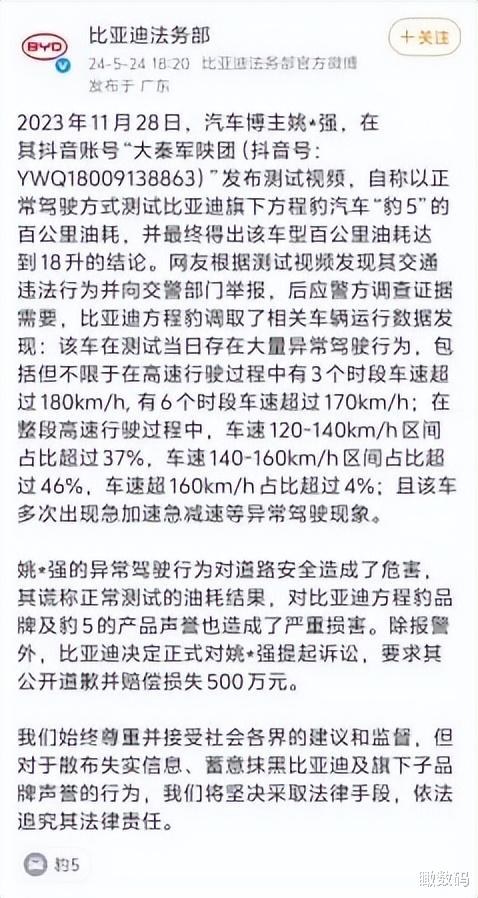 2023 年 12 月,方程豹豹 5 上市之际,姚*强通过抖音账号“大秦军陕团”发布视频,声称以正常驾驶方式测试方程豹旗下车型豹5,得出百公里油耗18升的结论,在网络上引起了大范围的关注及讨论。之后应警方调查取证需要,比亚迪调取数据显示:测试当日车辆存在大量异常驾驶行为,高速行驶过程中有3个时段车速超过180km/h, 有6个时段车速超过170km/h,在整段高速行驶过程中,车速120-140km/h区间占比超过37%,车速140-160km/h区间占比超过46%,车速超160km/h占比超过4%。