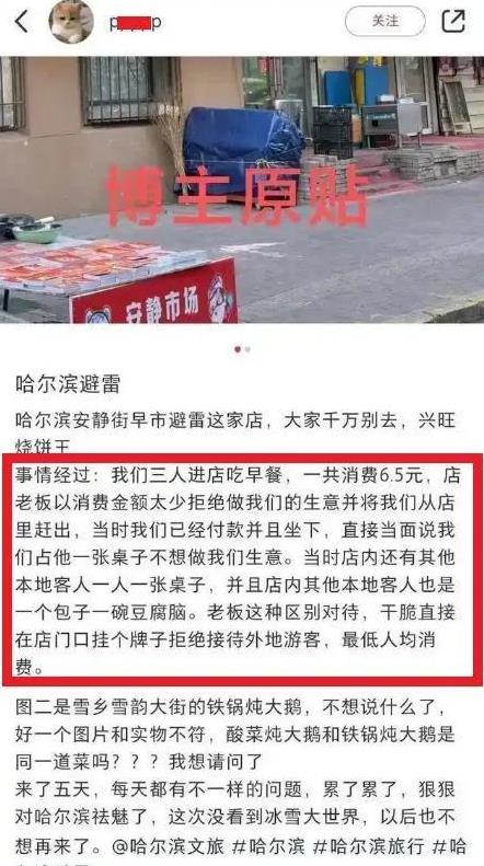 12月29号,一个南方网友在自己的社交平台吐槽,表示再也不去哈尔滨了,还在文章里表示,自己在哈尔滨一家叫兴旺烧饼王早餐店吃饭,被老板赶出来了…网友表示自己在店里消费了6.5元。买了包子和豆腐脑,但店主却觉得自己点得太少,把自己赶出来了…