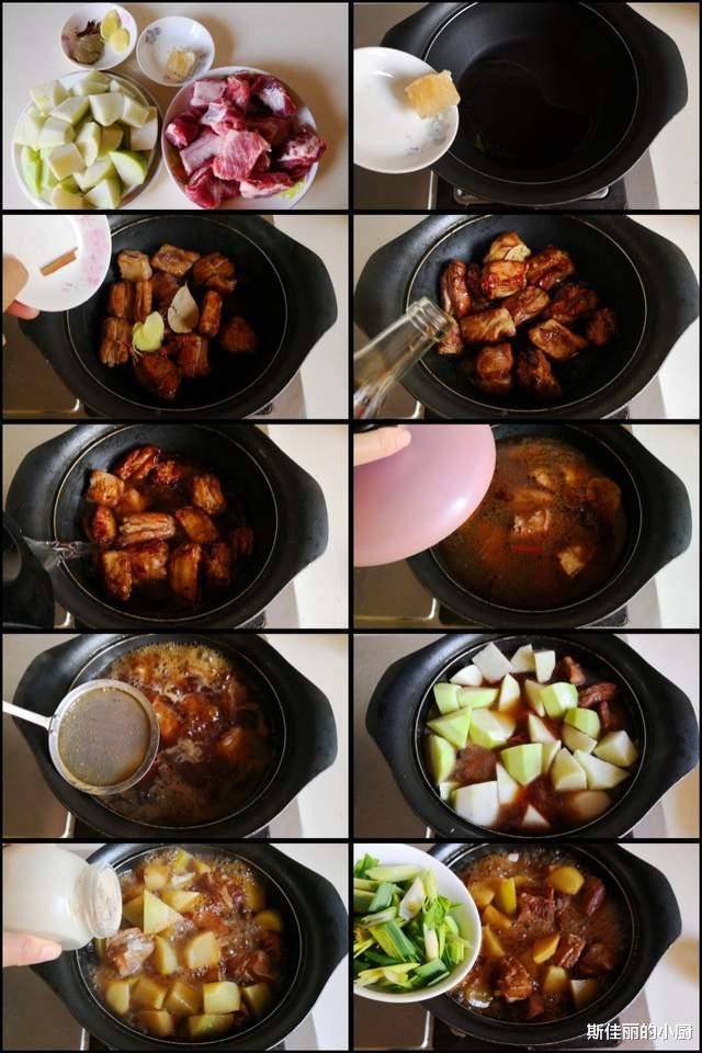 制作:1. 准备好原材料; 2. 烧热锅放入少许油, 将1小块冰糖放进锅中翻炒至完全融化; 3. 加入排骨放进锅中煸炒干水分,加入少许姜片、八角等大料放进锅中煸炒香; 4. 加入少许料酒和酱油放进锅中翻炒均匀; 5. 加入少许水; 6. 大火煮开后撇去浮沫; 7.加盖后转为小火炖煮二十分钟;8. 再将准备好的萝卜块放进锅中炖煮五分钟; 9. 加入少许盐和胡椒粉调味翻炒均匀后大火收汁; 10. 最后加入少许青蒜即可;